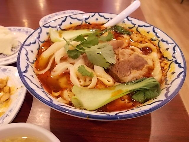 そして頼んだ麻辣牛肉麺が到着。この店は刀削麺も売りにしているそうで、麺は刀削麺でしたね。