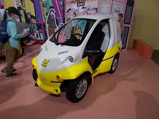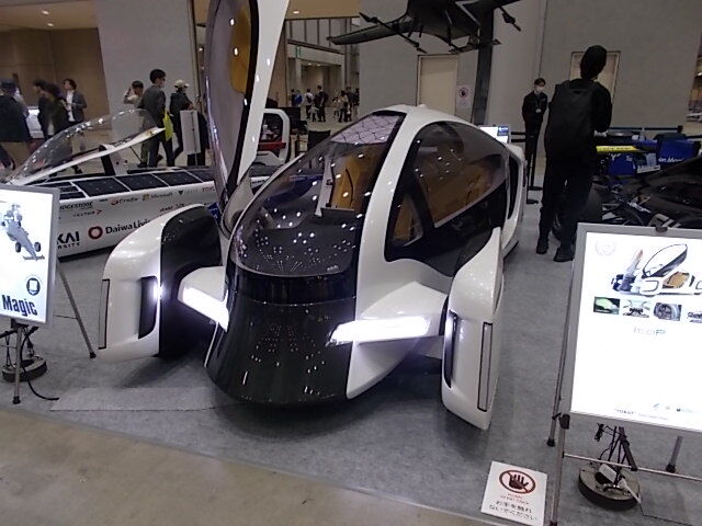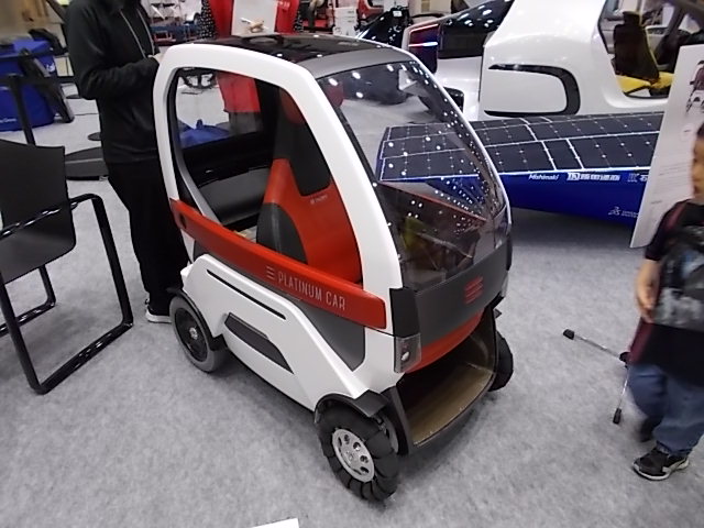 その先にはスタートアップ企業などのEV展示ブースがあり、最初のブースには電動車椅子のサイズと最高速度なのだけどきちんと屋根がついて車っぽい形をしているものや飛行機のような形状の車など面白いものがありました。