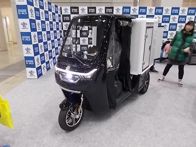 次いで、電動トライクの(株)ビークルファンのブースを見たら個性的な三輪車が多数展示されていて、トラックタイプのもの、後部座席を備えたもの、電動自転車に近い形状の軽量のものなど色々ありました。