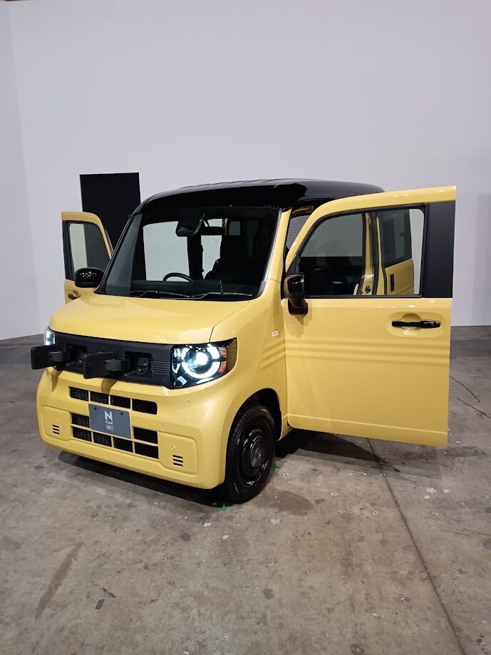 他社OEMなのかオリジナル車体なのかは分かりませんが、昔のフェアレディZなどを彷彿させるレトロ感溢れるデザインで、クーラーが普及する前の時代の車では必須装備だった三角窓まで再現されているのが印象的でした。