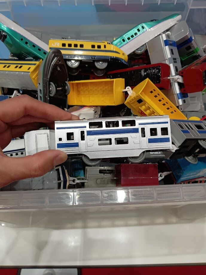 プラレールをさりげなく見ていたら、常磐線グリーン車が明らかに実際のE531系ではなくかつて東海道線などを走った211系グリーン車(常磐線だから415系1500番台とでも言った方がいいのか)の形をしているなど突っ込みどころがあるし、プラレールの巨大なレイアウトがあって、前面窓がミッキーマウスの顔になっている新幹線風ダブルデッカー車など架空鉄道趣味的に気にならずにはいられない変な架空車両が走っているなど、大きなお友達である私も思わず足を止めてしまいました。