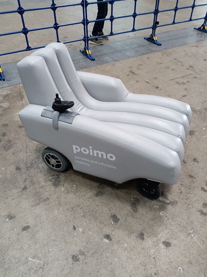 色々な形のものがあって、まずはソファ型の椅子に電動車椅子の操作レバーをつけた「poimo」というパーソナルモビリティに乗車。歩くより少し速い電動車椅子並みの速度(6km/h)でしか動かないので安全ではあるけど、この操作は慣れないと怖いものがありますね。