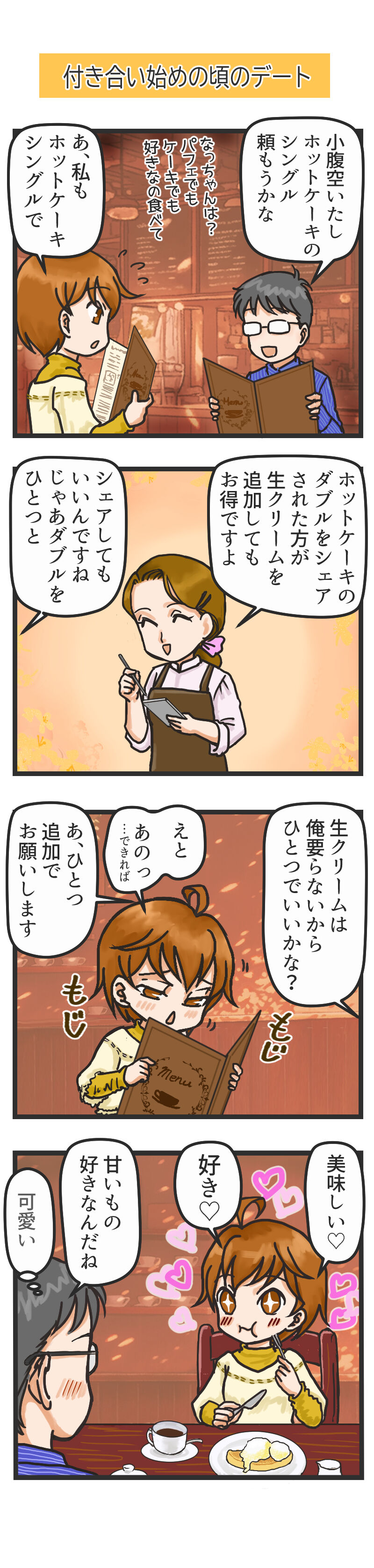 2025年02月28日 星乃珈琲のスフレパンケーキ コメント数:0 コメント カテゴリ:エッセイ漫画 by sinkorswim_t ブログネタ:【公式】お気に入りのチェーン店 に参加中! 喫茶店のホットケーキが好きです。スフレタイプの物も昔ながらのホットケーキもいいですね。星乃珈琲の名物スフレパンケーキが好きでまた食べたいと思いつつもう何年も行ってません。これは別のカフェ?ケーキ屋さんのパンケーキ。一度だけ行った横浜赤レンガの「bills」のリコッタチーズ入りパンケーキ。店内が薄暗かったので綺麗に撮れてませんが、とても美味しかったです。お値段もすごかったけど。このとき行った喫茶店はなんて名前かもう忘れてしまったのですが、レトロ風なパンケーキでした。多分これかな?シェアする前のダブルホットケーキ。しっかり焼色がついていて懐かしい味。また行きたいです。家で焼いてみたリコッタ入りパンケーキ。しっとりして美味しかったです。オタク夫婦の日常日記 ep10AmazonKindleインディーズにて無料DL中。コロナ禍自粛生活日記にほんブログ村 タグ :#ホットケーキ#パンケーキ#絵日記#エッセイ漫画#4コマ#夫婦#喫茶店