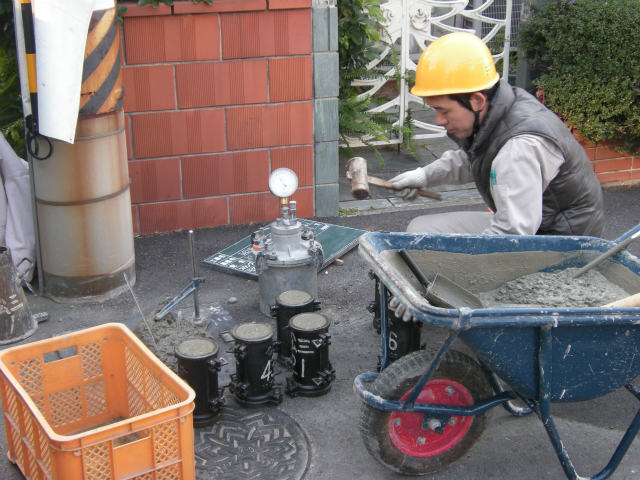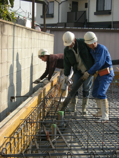品質の確認してから打設を開始します、数名の職人さんが