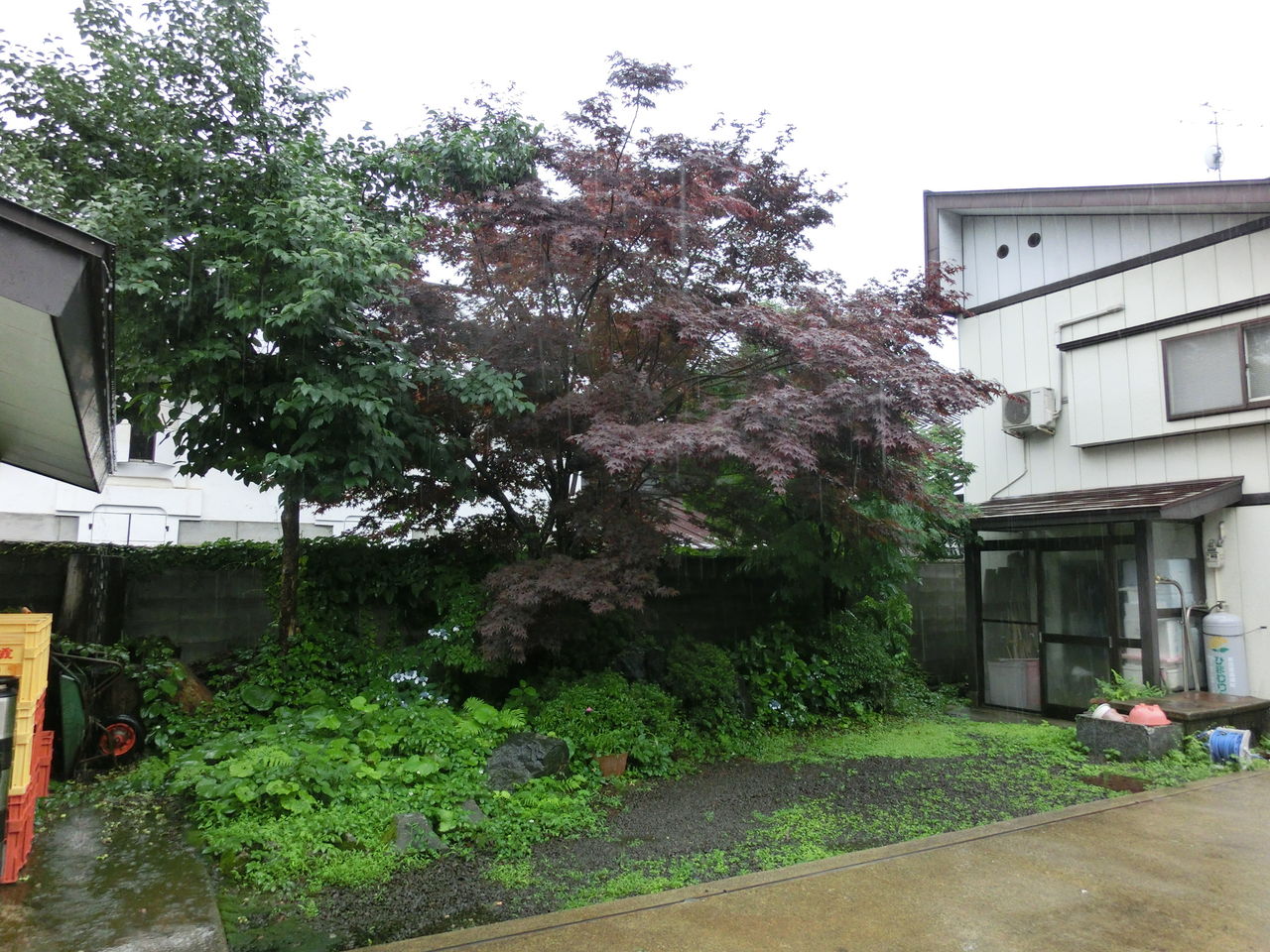 今朝は小雨。