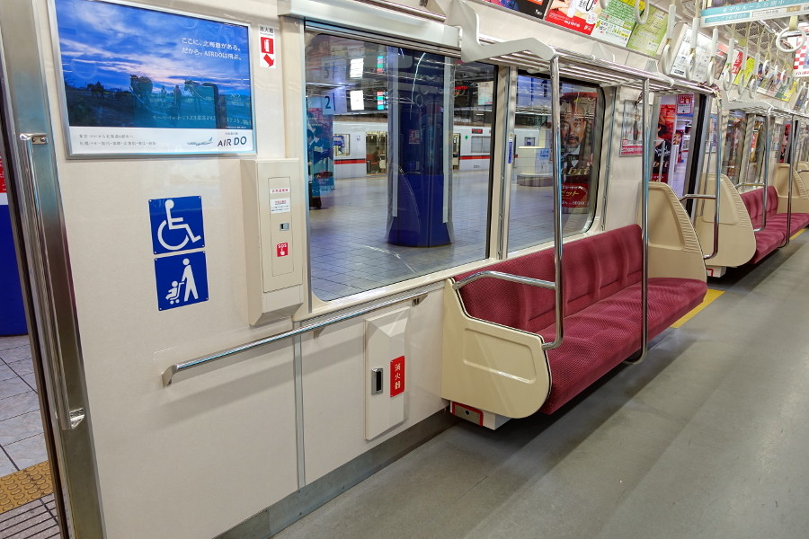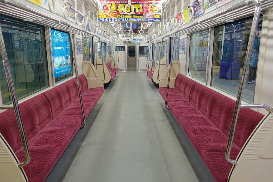 アルミ車では存在した運転室直後の座席は、運転室の拡大に伴い消滅してしまいました。手前の車椅子スペースと併せてラッシュ時には立席スペースとして重宝しています。運転席側の窓のみ小さくなっていますが、これは避難梯子が収納されているためです。