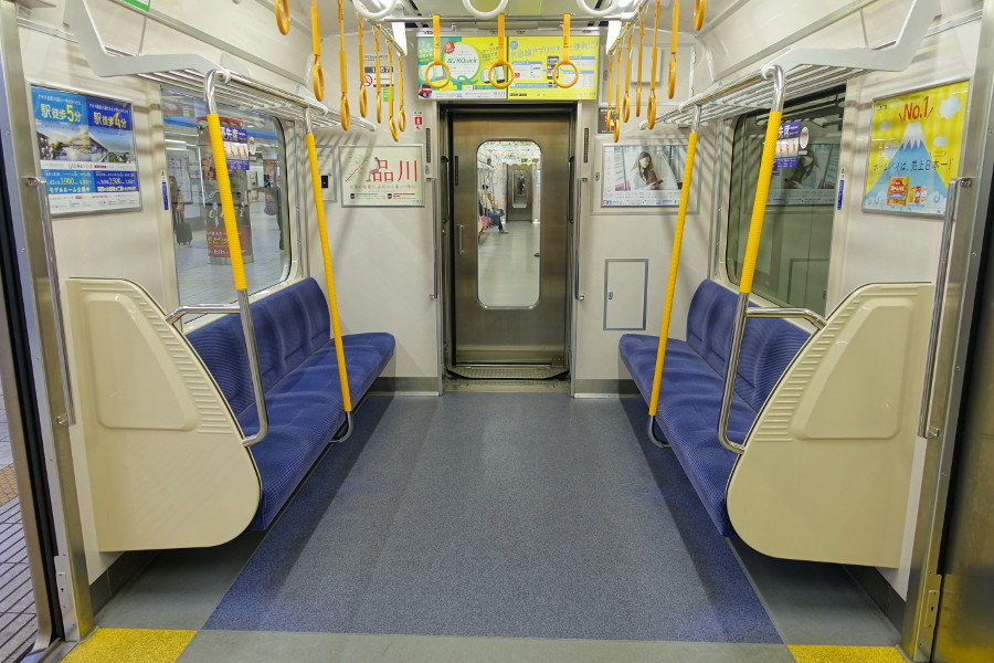 こちらは優先席です。モケット・吊革・床面の色が異なるので一目で分かるようになっています。握り棒の色が黄色くなっているのは色覚障害者にも配慮したものと思われます。この握り棒だけでも微妙に差異があったりするので、車内学は奥が深いです。