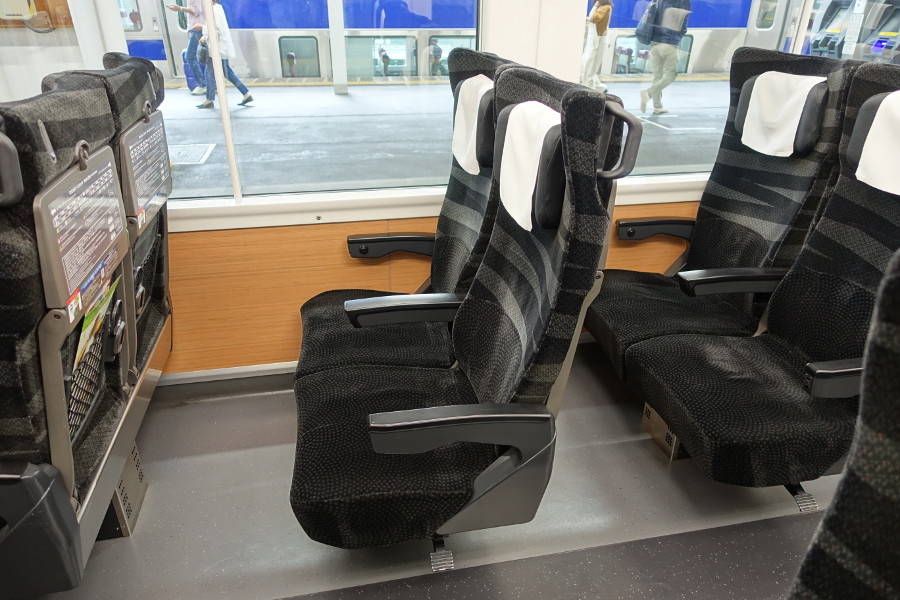 座席は背ずりが大型のもので、新幹線でも採用されている可動式枕を装備しています。シートピッチはやや狭いですが、座席が片持ち式なので足を延ばす事は出来ます。さらに肘掛けにはコンセントが装備されています。普通車でここまでのサービスを受けられるのは嬉しい限りです。
