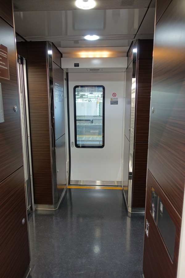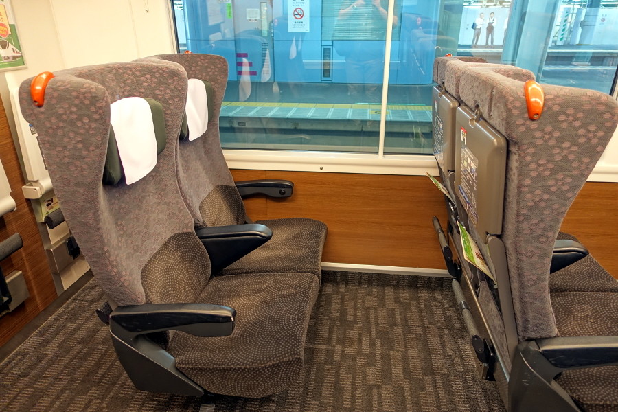 こちらはグリーン車です。暖色の照明で落ち着いた雰囲気になっていますが、正直普通車との違いがあまり感じられません。