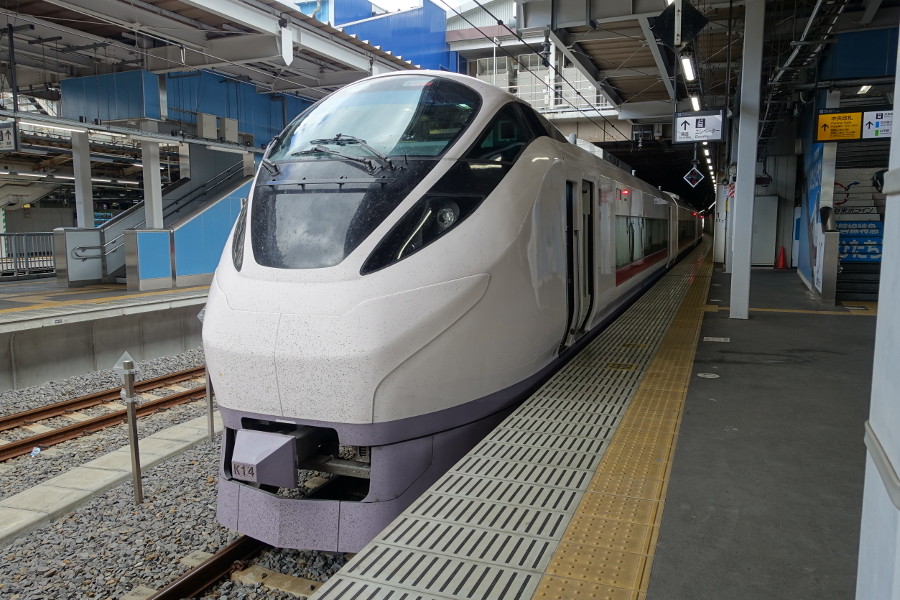 外観は651系を踏襲したのか白を基調としたデザインになっていて、梅をイメージした赤い帯が入っています。前面の形状が非常に独特な雰囲気で賛否分かれる所です。
