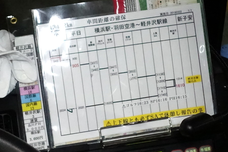 軽井沢駅バスターミナルで待機していたのは新子安営業所のJ6739号車でした。去年入ったばかりの比較的新しい車で、車内に入ると新車の香りが残っていました。軽井沢駅からは品川まで2名と横浜まで4名の乗車でした。当日運賃での支払いが2名も居たのには驚きました。この路線は前売割引でかなり安くなるので、逆に割引運賃で乗って申し訳無いと思うくらいです。