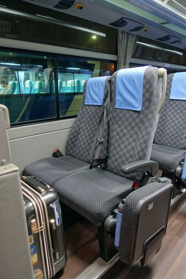 私は運転席側最前列に乗車しましたが、足元はそこそこ伸ばせて隣に誰も来なかったおかげで長時間の乗車でも快適でした。ただしリクライニングはほとんど倒れなかったのが気になる点でした。空港リムジンバスとしての運用がメインなので、あまり倒れると問題があるのでしょうか?