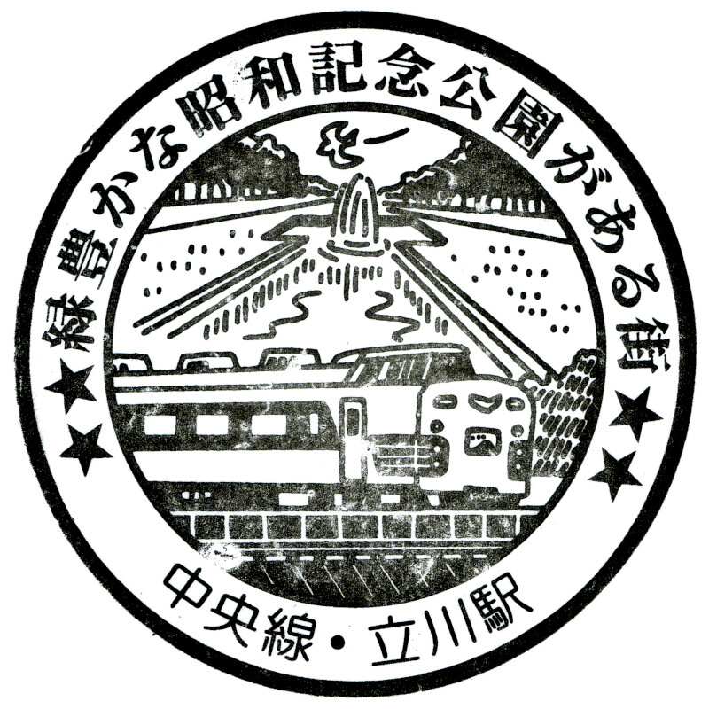 立川駅のスタンプは「緑豊かな昭和記念公園がある駅」となっています。中央線特急で活躍していた183系が描かれています。