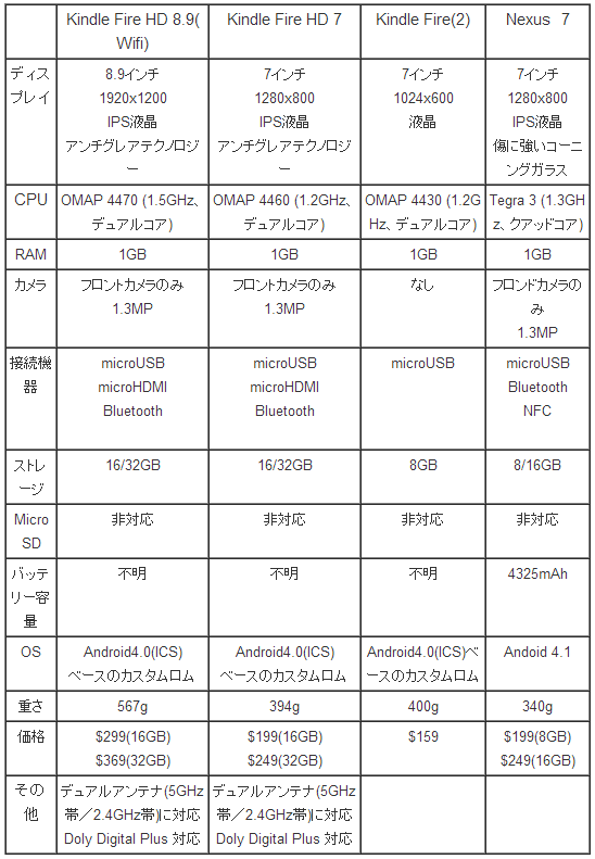 Kindle Fire HDシリーズとNexus 7のスペック比較