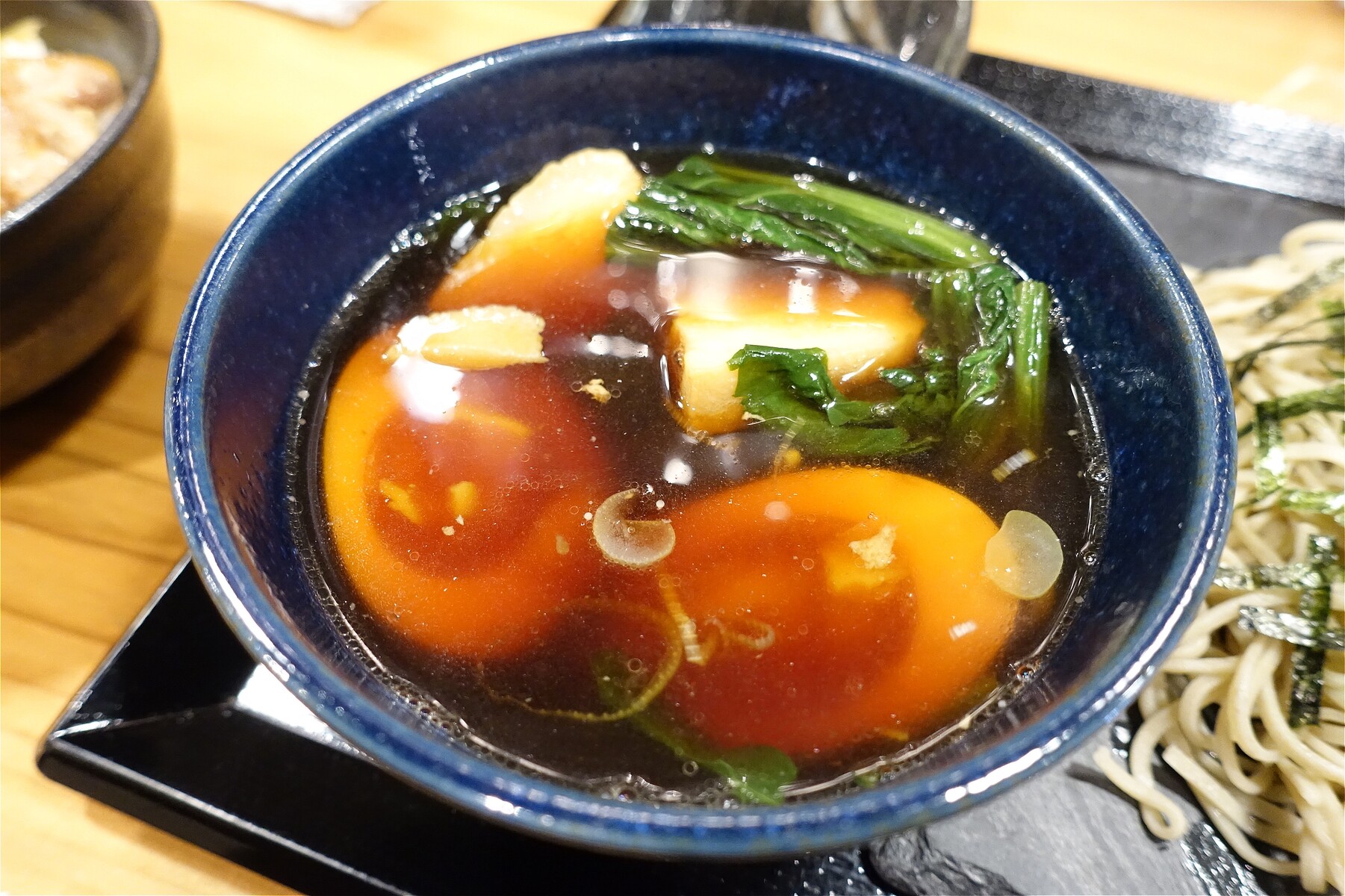 つけ汁はメニュー名通りに青菜と豚角煮がしっかり入ってます。