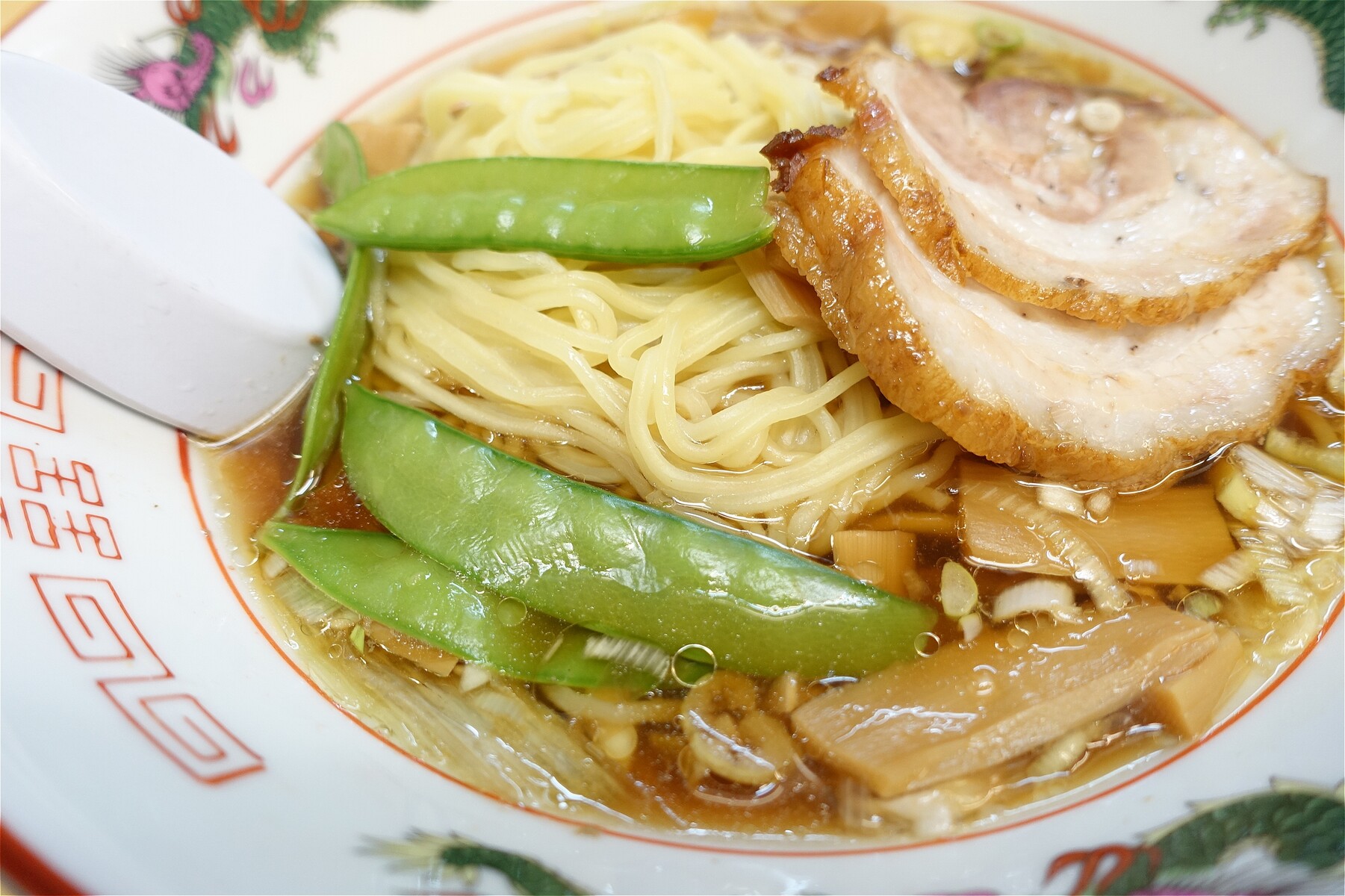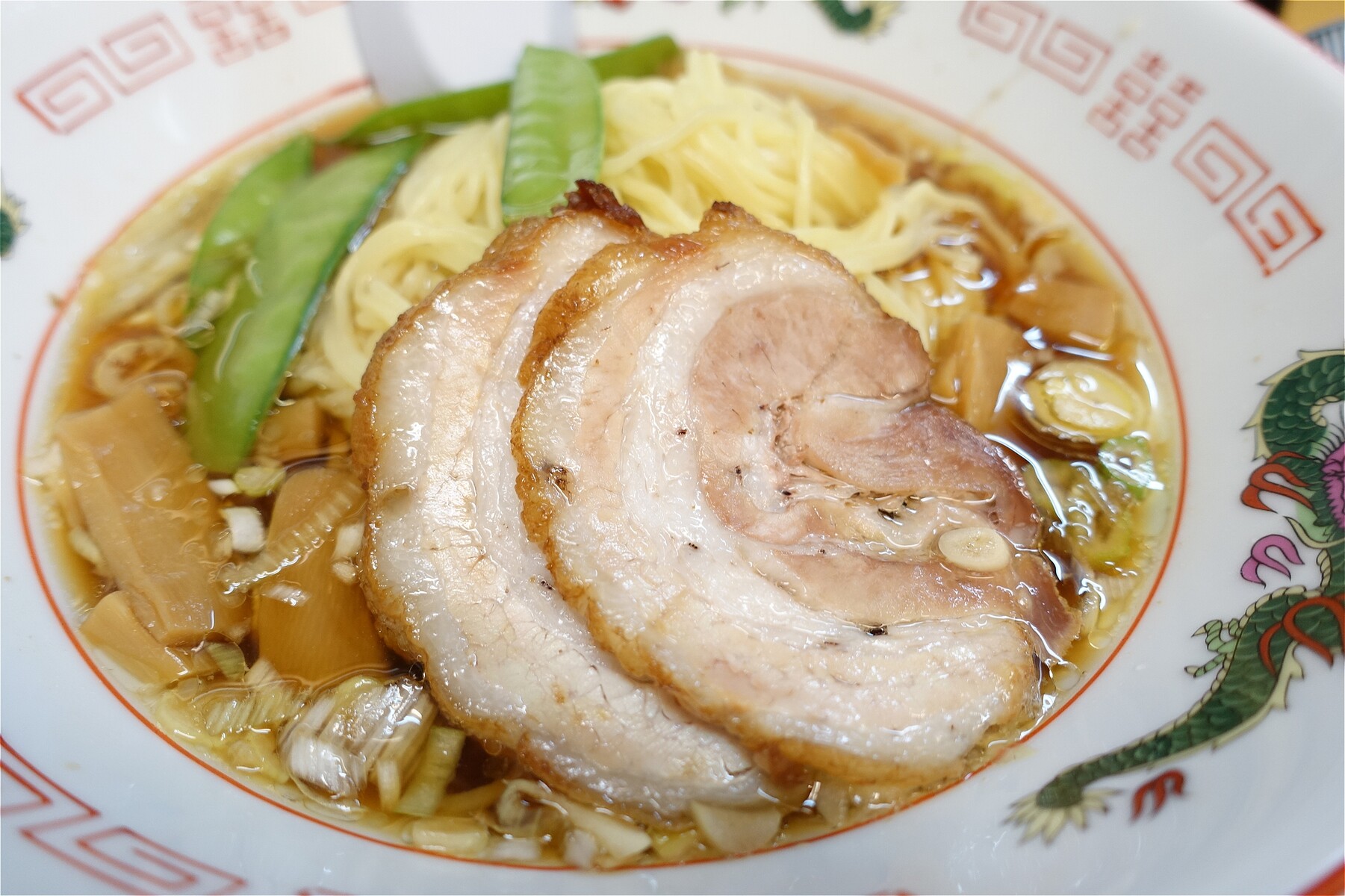 ラーメンもいつも通り、チャーシュー2枚とメンマに絹さや、ネギをパラりでキマリです。