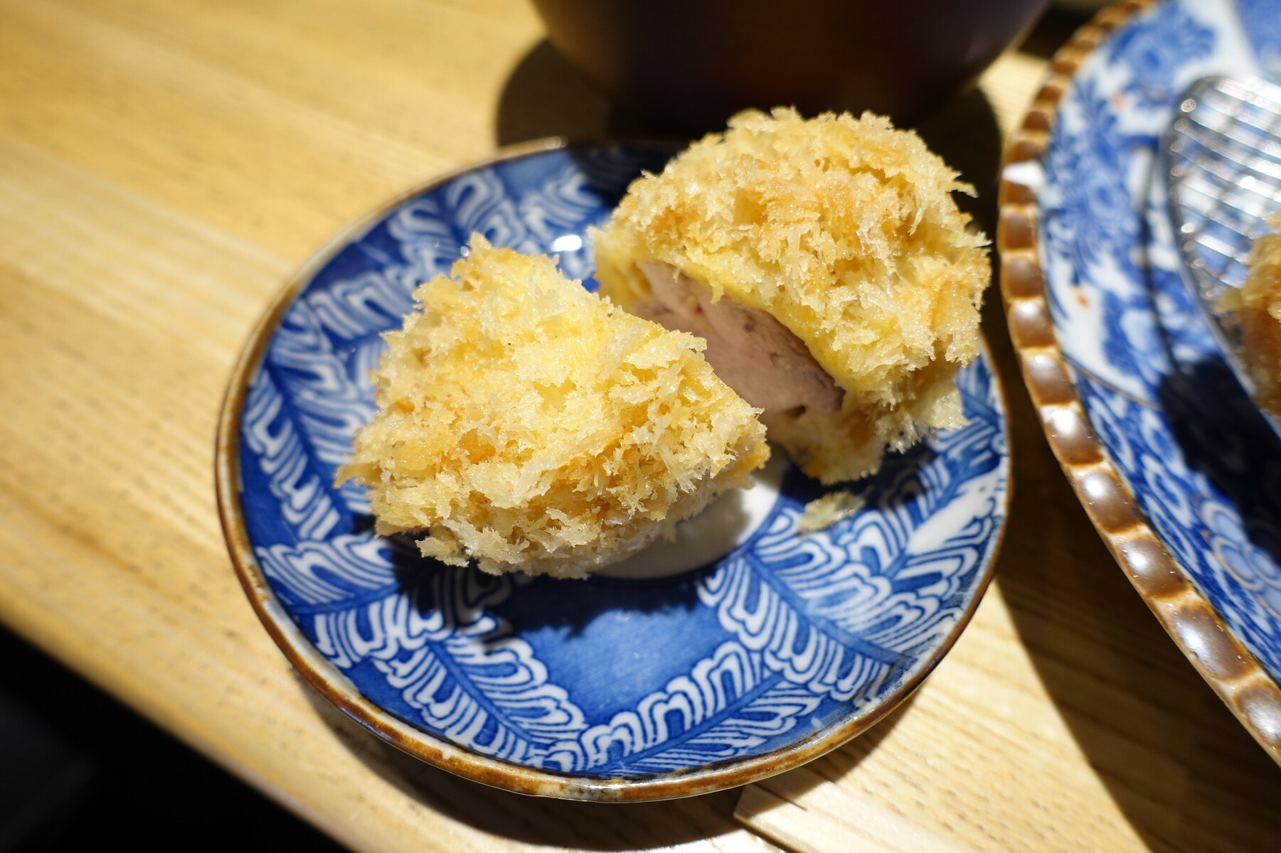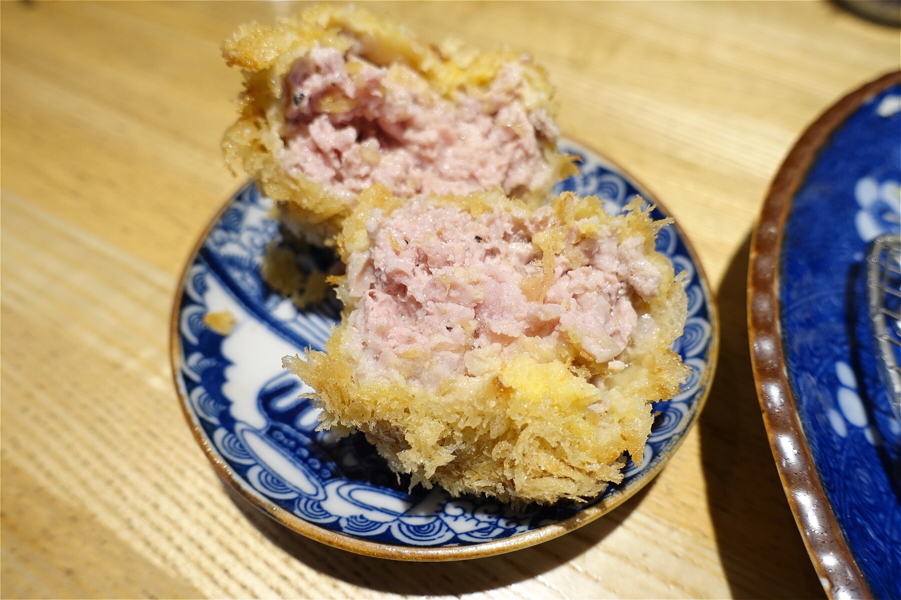 お肉感をガッツリ感じられるボール状のメンチカツ、こちらはソースがお気に入りの味付けです。