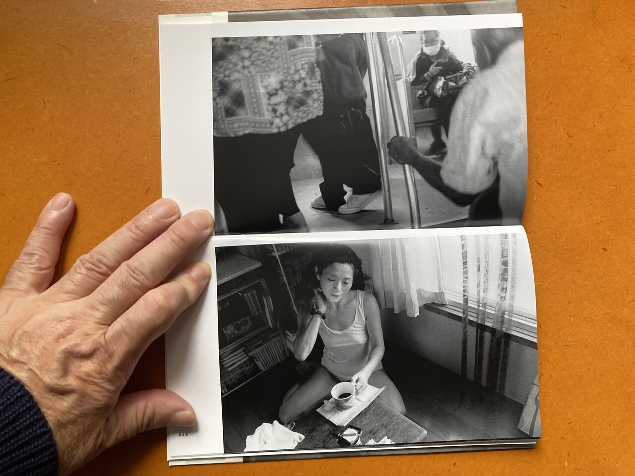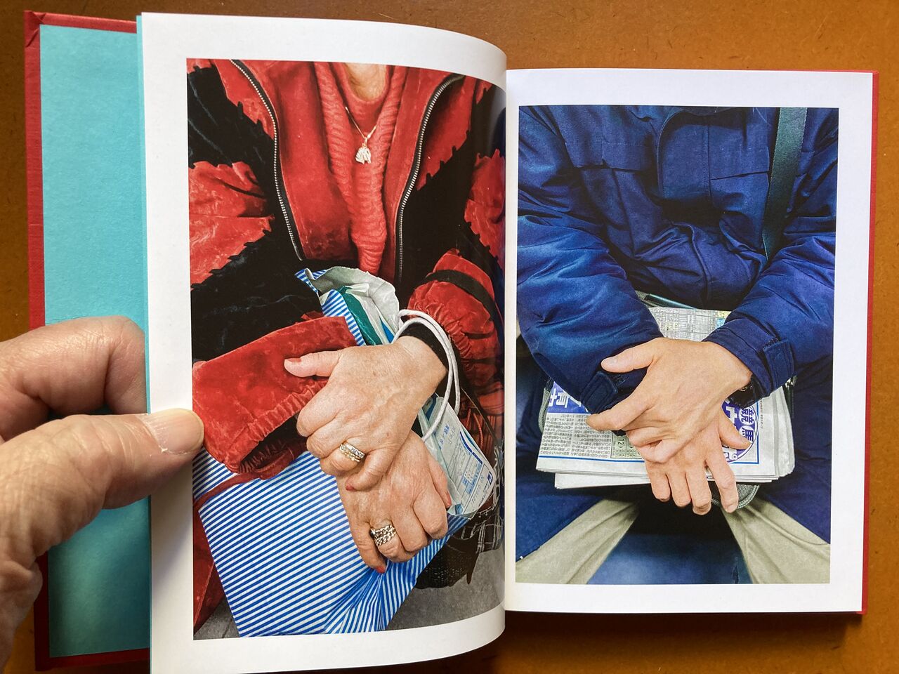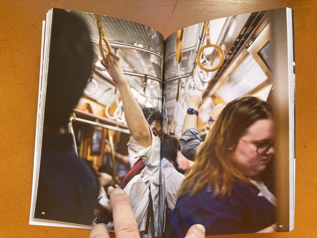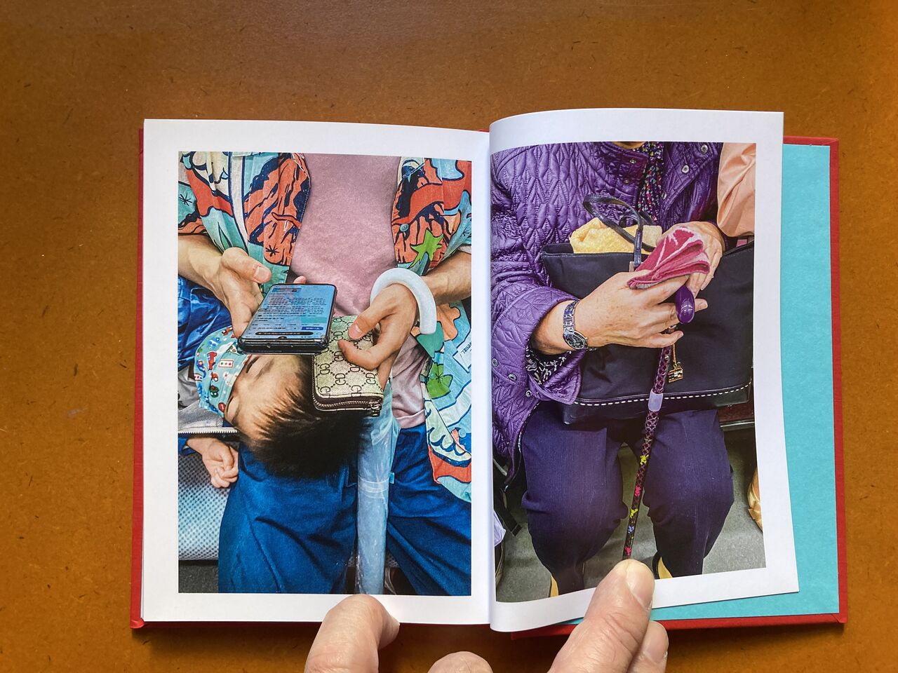 『 東京の地下鉄では、座席が車両の側面に窓を背に向ける形で配置され、立って乗車する人々は、中央のスペースで、座っている乗客に向かって立ちます。立って乗車する人は、この高い視点から、座っている乗客を見下ろすと、その人たちの手、その態度、持っているもの、その人たちの本、携帯電話の画面などが自然と目に入ってきます。地下鉄で立って乗車している間、ほとんどの人々がしているように、時間を潰して携帯電話を手に持って、私の視点から座って乗車している人々の景色を写真に撮り始めました。2020年から2023年にかけて、東京を訪れ、地下鉄に乗る度に、物語性のある人の手、個性的な服装をしている人探すようになりました。』(本書日本語テキストより抜粋)