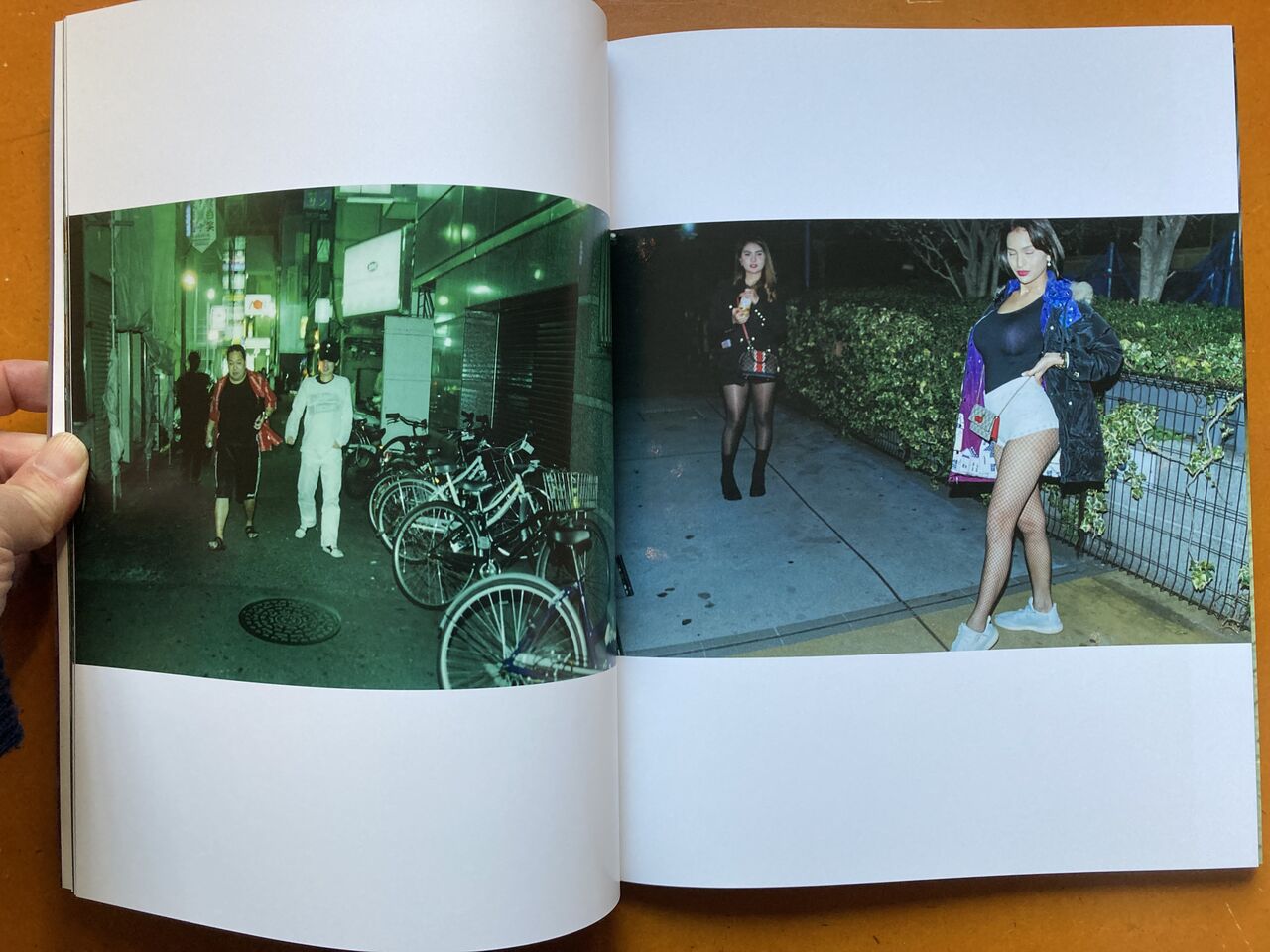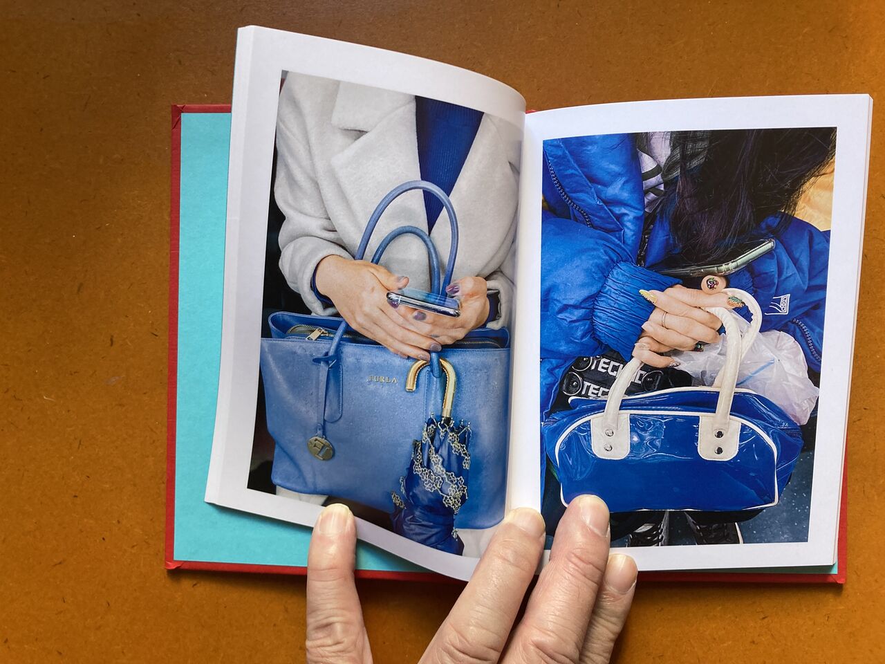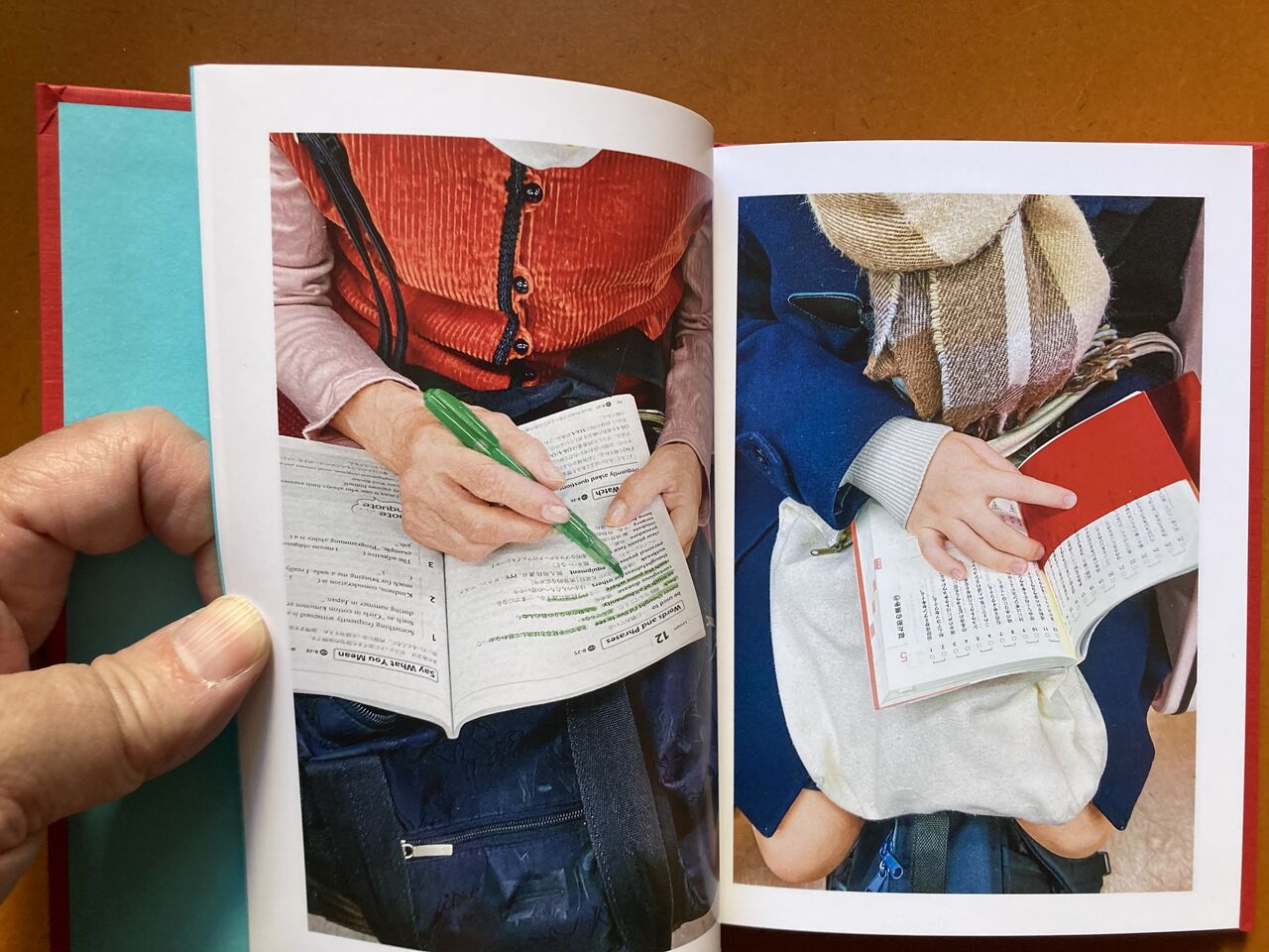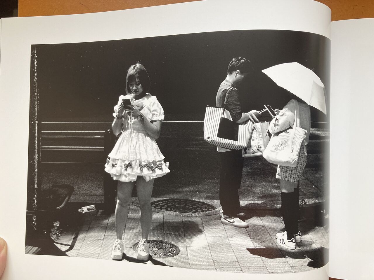 『 東京の地下鉄では、座席が車両の側面に窓を背に向ける形で配置され、立って乗車する人々は、中央のスペースで、座っている乗客に向かって立ちます。立って乗車する人は、この高い視点から、座っている乗客を見下ろすと、その人たちの手、その態度、持っているもの、その人たちの本、携帯電話の画面などが自然と目に入ってきます。地下鉄で立って乗車している間、ほとんどの人々がしているように、時間を潰して携帯電話を手に持って、私の視点から座って乗車している人々の景色を写真に撮り始めました。2020年から2023年にかけて、東京を訪れ、地下鉄に乗る度に、物語性のある人の手、個性的な服装をしている人探すようになりました。』(本書日本語テキストより抜粋)