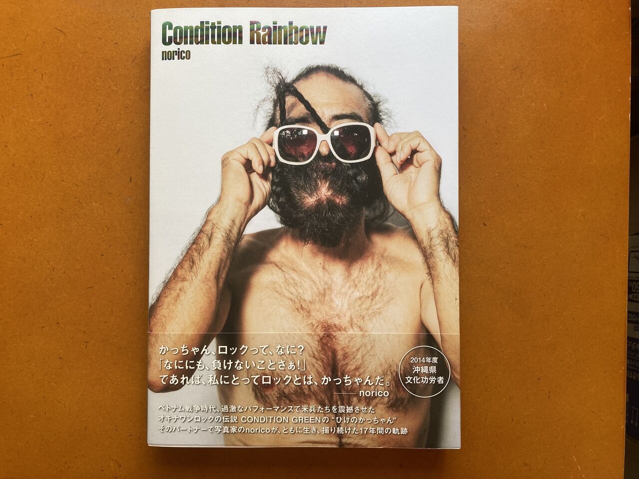 『ベトナム戦争時代、アメリカ軍基地を抱えるコザでは、戦争に駆り出される若い米兵たちが、夜な夜な、街に繰り出し、ライブハウスにたむろしていた。そんな米兵たちを相手に、蛇を食いちぎり、鶏の血を啜るなど、過激なパフィーマンスで圧巻のステージを繰り広げたのが、1971 年結成の伝説のロックバンド、コンディション・グリーンのボーカル “ひげのかっちゃん” こと、川満勝弘。 2006年7月2日、写真家のnorico は、旅行で訪れた沖縄・コザで、この “ひげのかっちゃん” に出会う。以来、彼を撮影することがライフワークとなったnorico は、いつしか彼のパートナーとなり、彼が亡くなる2023年4月20日、その最後の瞬間までそばに寄り添い、シャッターを押し続けた。 “ひげのかっちゃん” が亡くなって一年、この夏、発表されるこの写真集は、基地の街・コザで、音楽を通して、沖縄に生きる人々を奮い立たせてきた伝説のロックミュージシャンの生き様を写し出したものでありながら、同時に、パートナーとしてともに生きたnorico だからこそ撮れた、ひとりのチャーミングで豪快な男の姿が数多く収録されている。 *写真集の中には、norico による、かっちゃんとの日々を綴った原稿が入ります。 *かっちゃんが遺した、学生時代から70年代のコンディション・グリーン時代の写真も含まれています。 *中には、かっちゃんが残した手書きの詩が挟み込みされます。 *カバーのタイトルはレインボー箔となります。』(オフィシャルの紹介文より)