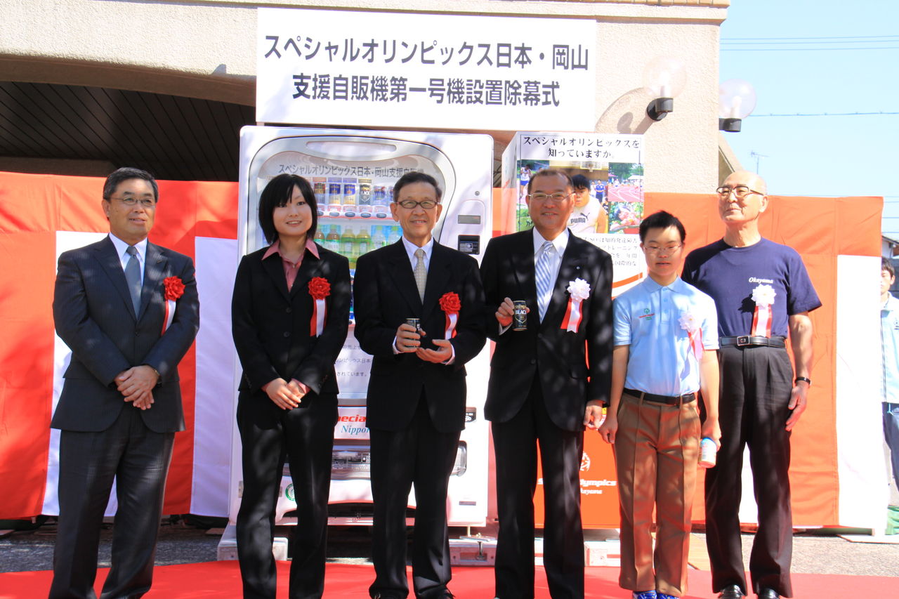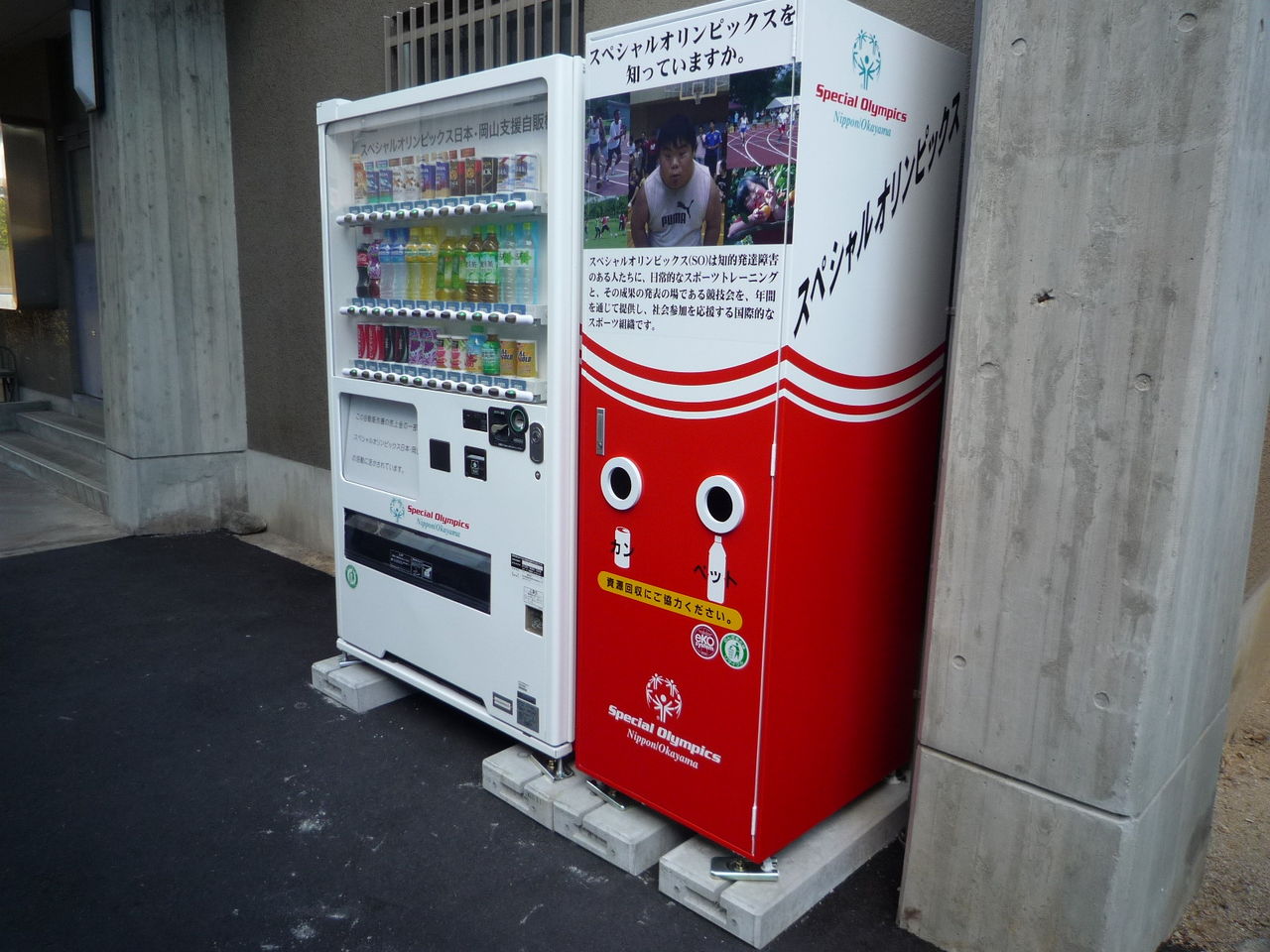 コカコーラウェスト(株)のご協力で、岡山でも支援自販機の設置が進んでいます。皆さんもよくご存知の真っ赤のコカコーラの自販機と少しデザインが違って、白地にSON・岡山のロゴや名称、アスリートたちの写真などが入っていて、皆さんに広くスペシャルオリン