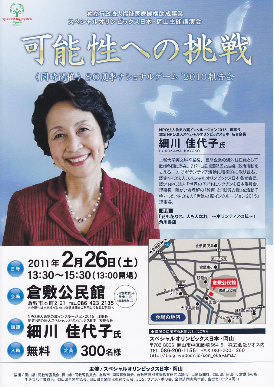 細川さんの近著「花も花なれ、人も人なれ」(角川書店)には、細川さんの生い立ち、スペシャルオリンピックスとの出会いと取り組み(講演会で語られたこと)、現在取り組んでおられることなどが、熱く語られています。興味のある方はぜひ読んでみてください。
