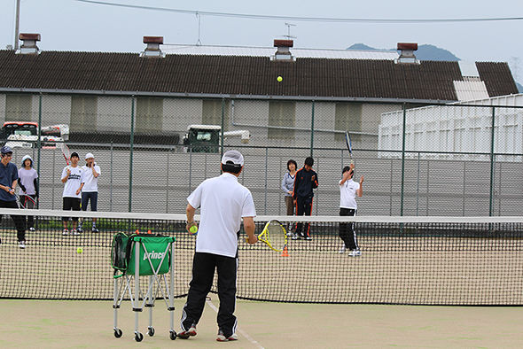 始めは音楽に合わせて準備体操(運動不足のファミリーにはハードです)、続いてストロークなどの基本練習を十分したあとレベルに合わせてラリー班とちょっと本格的な試合班に別れました。