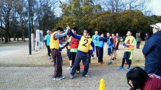 早速アップ。今日は、ミニ駅伝をするのです。アスリートは赤チーム、青チーム、黄チーム、オレンジチームに分かれ、即席パパさんチームも加わり、5チームで総合グラウンド内の