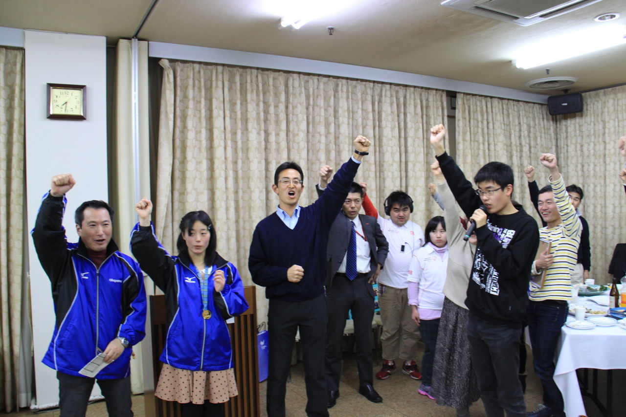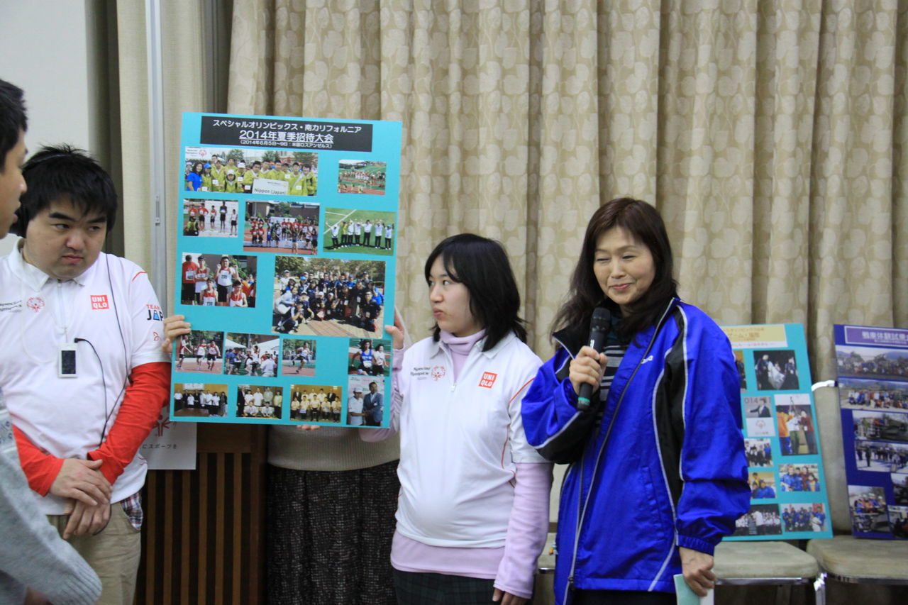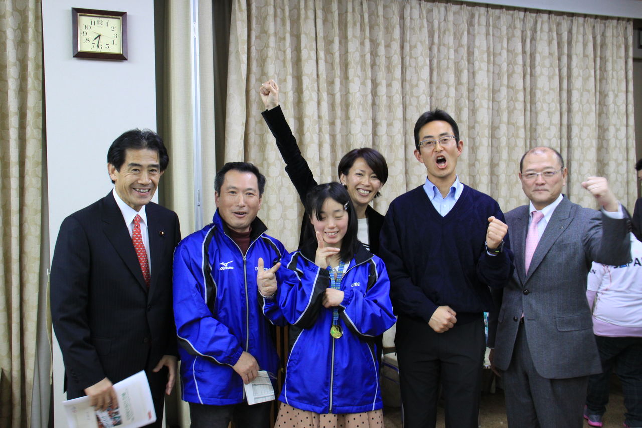 感謝状贈呈など盛りたくさんの内容でした。最後に、7月のワールドゲーム ロサンゼルス大会に出場するバドミントンの赤井さんと渡辺コーチ(水泳)小宮山コーチ(卓球)への壮行式も行われ、ア