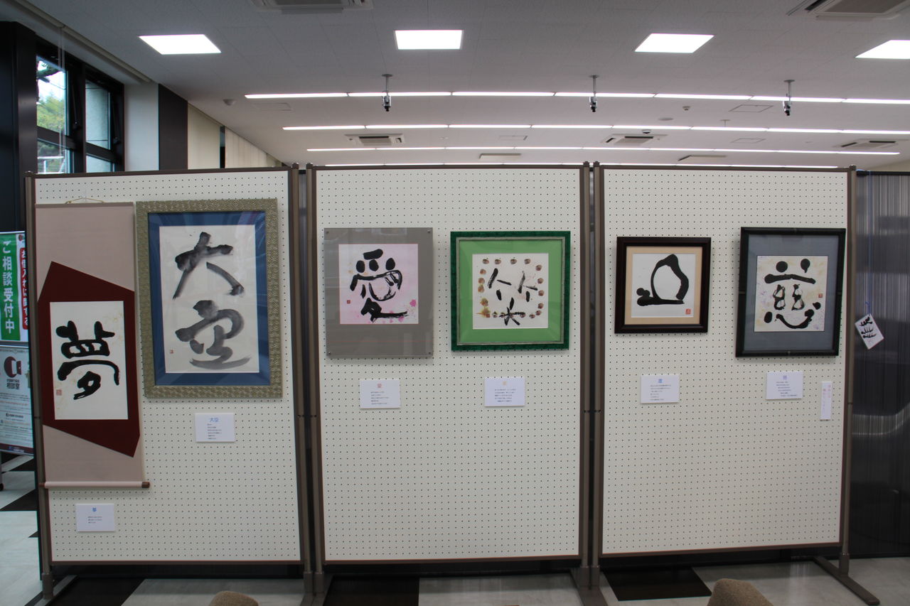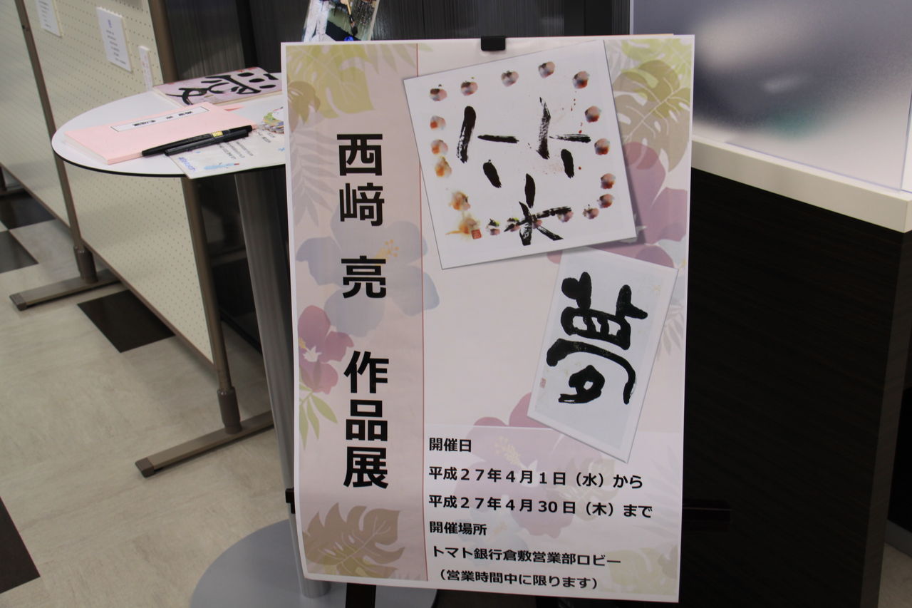 IMG_0009ボウリングに参加しているアスリートの西崎亮君の書の作品12点が、4月いっぱいトマト銀行倉敷営業部1階ロビーで展示されています。