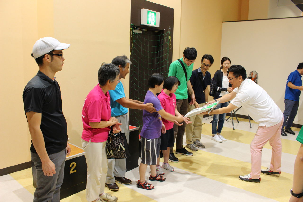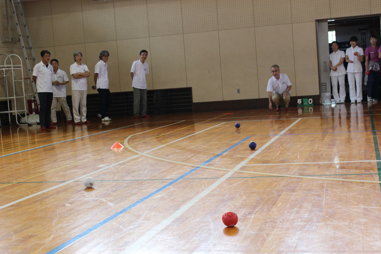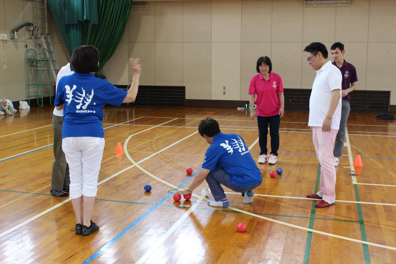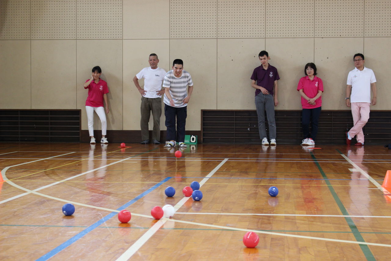 アリーナでは、岡山で今年から始まったボッチプログラムのコーチ達が中心になって、競技の説明をしたり、チーム分けをしてボッチのチーム戦が行われました。ほとんどの人が初めてやる競技でしたが、体力の無い人でも楽しめるし、