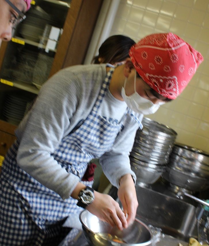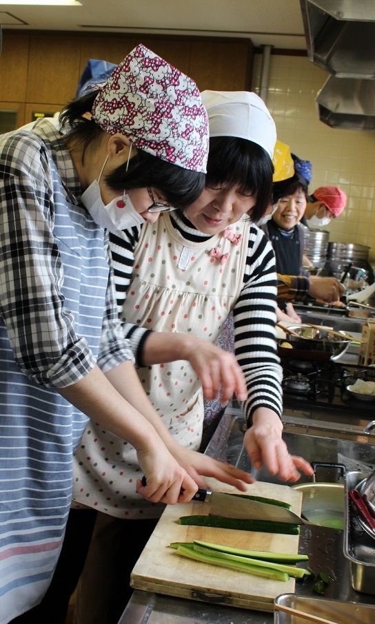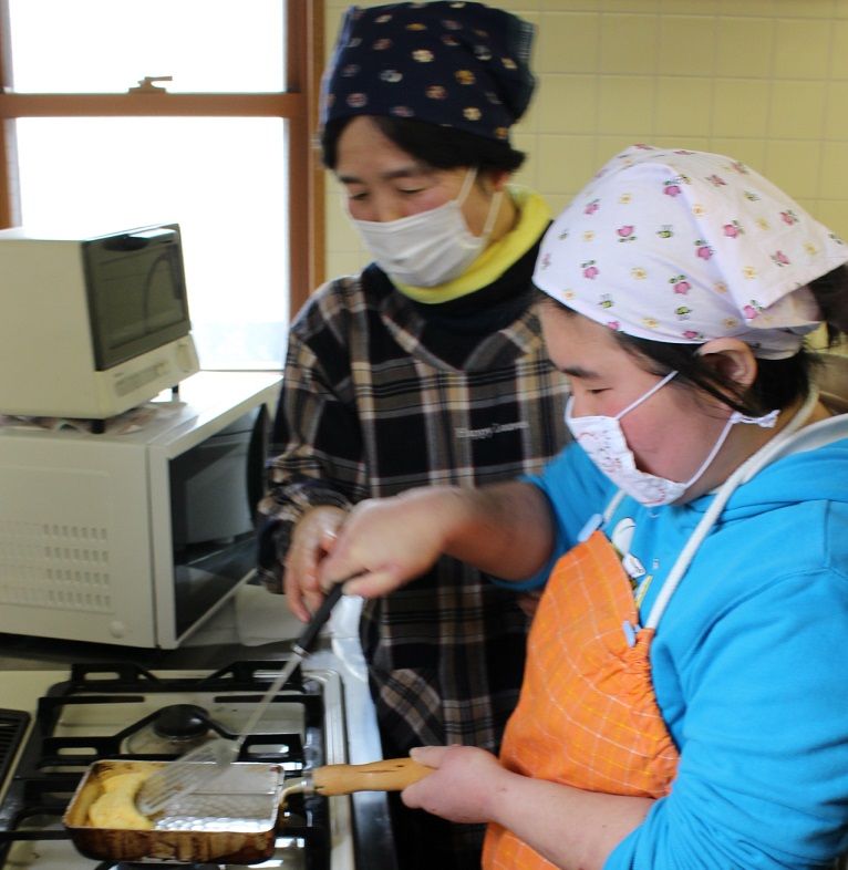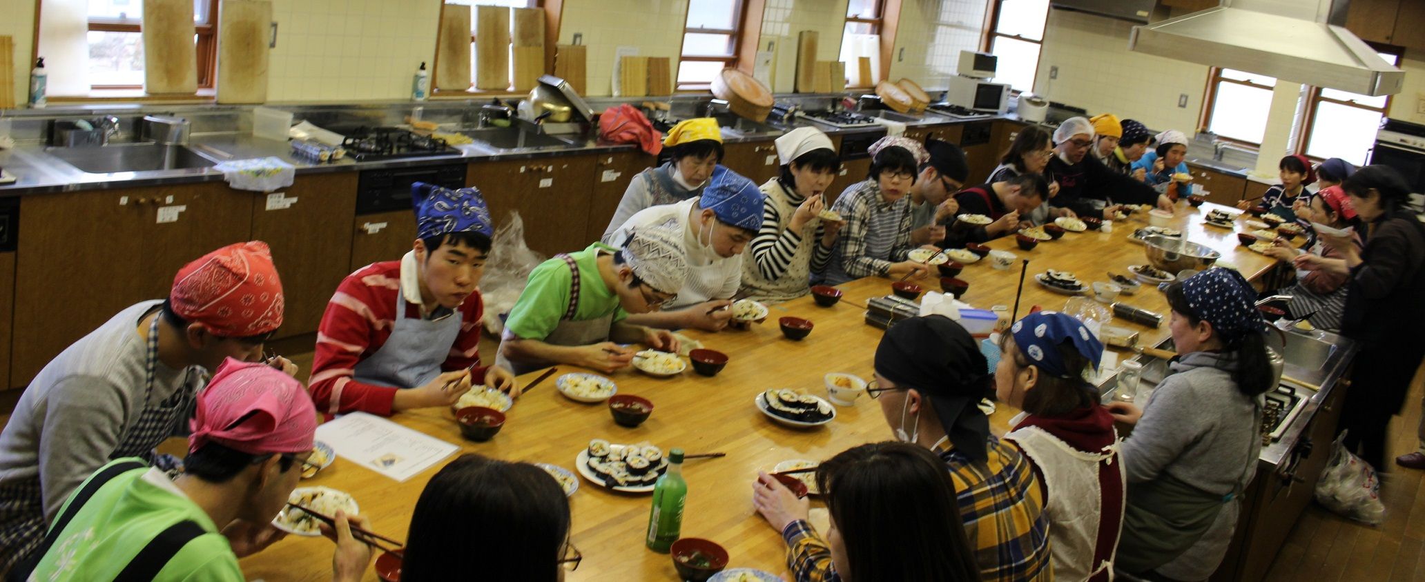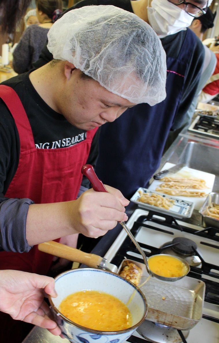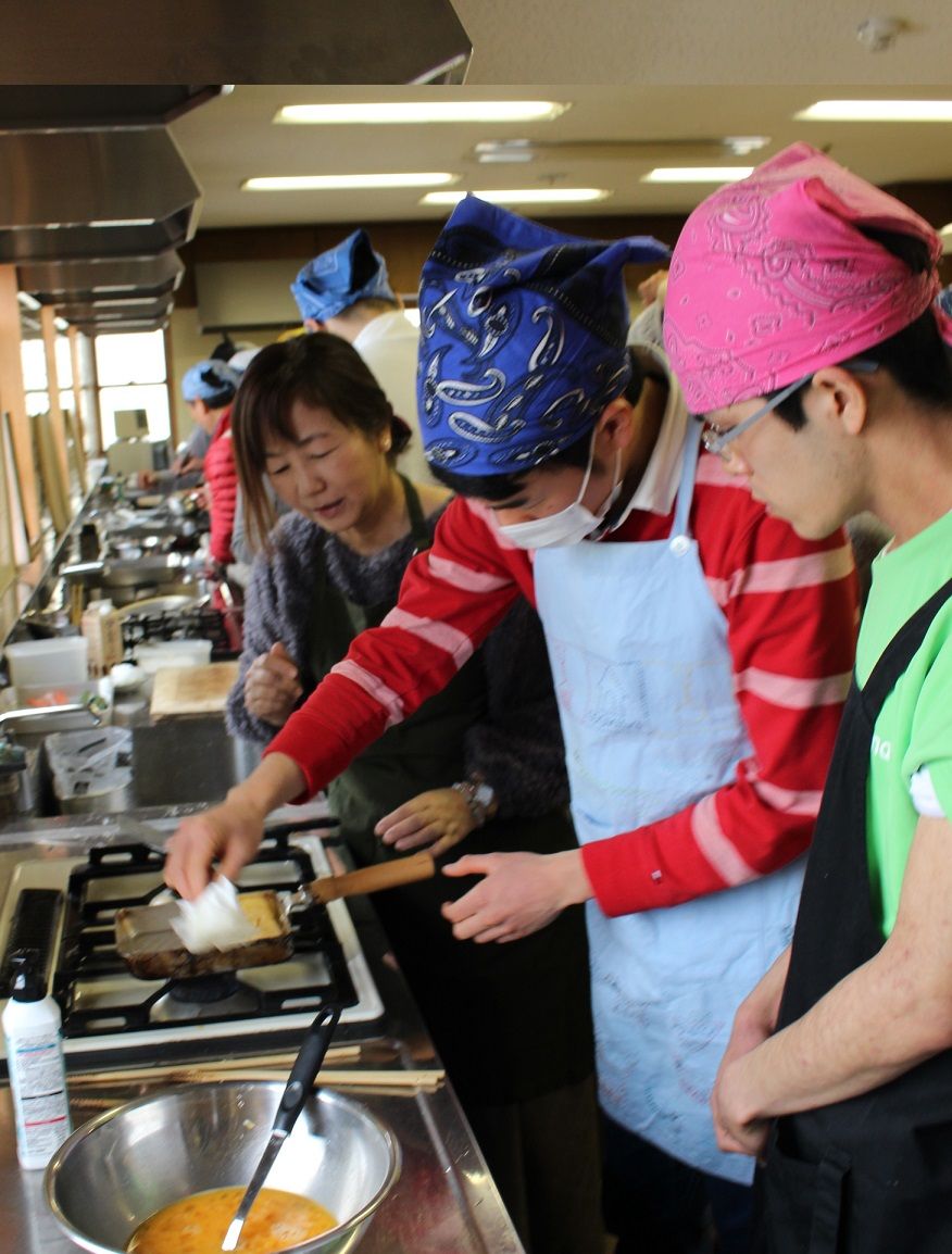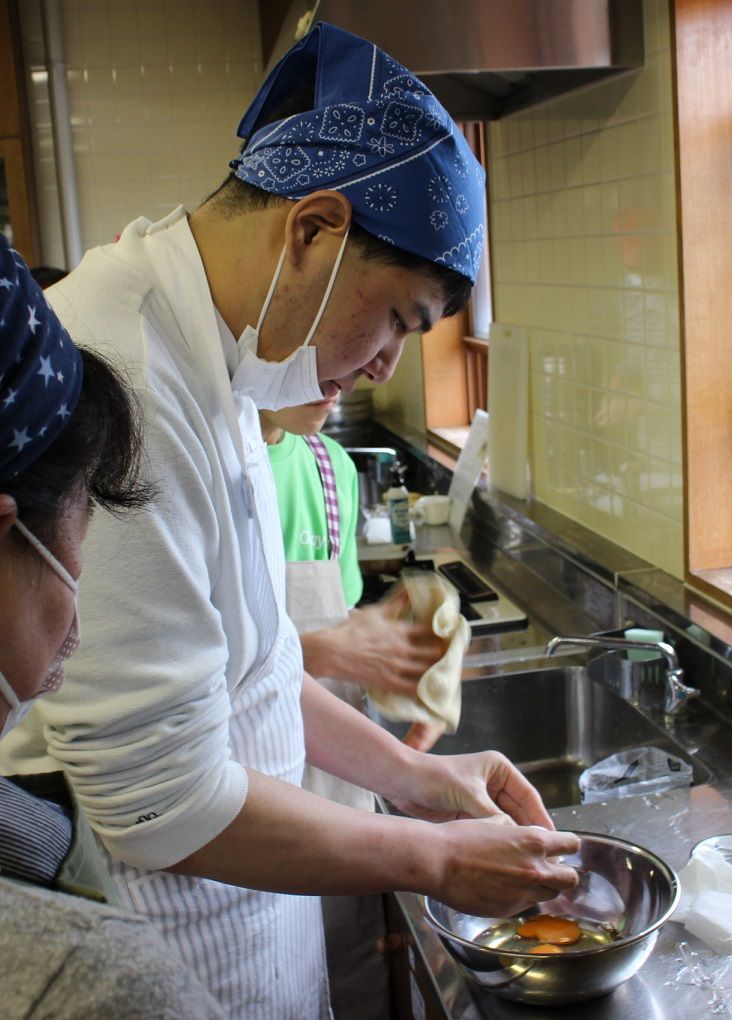 今年も実施しました。リピーターと今年初めてというアスリートが半々京山公民館の調理室に集まりました。5つの班に分かれて最初に卵焼きを作りました。ぐちゃぐちゃになってしまった〜、