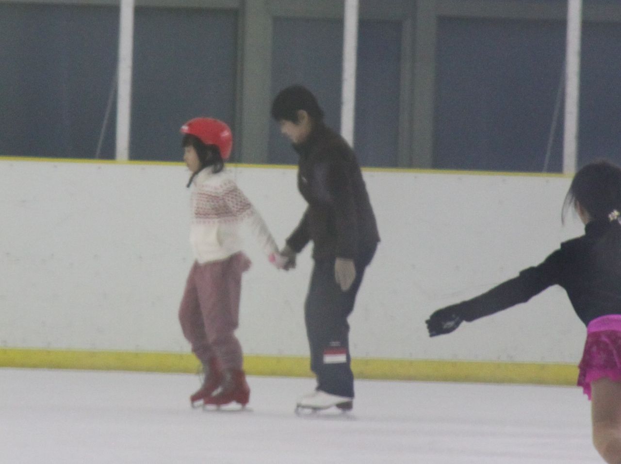 まゆちゃんも少しはにかみながらきちんと握手ができました。早速スケート靴をお父さんに手伝ってもらいながら履きました。ヘルメットもつけて準備はバッチリ、リンクに入ると補助具を使ったりコーチと
