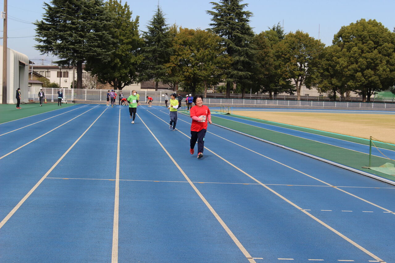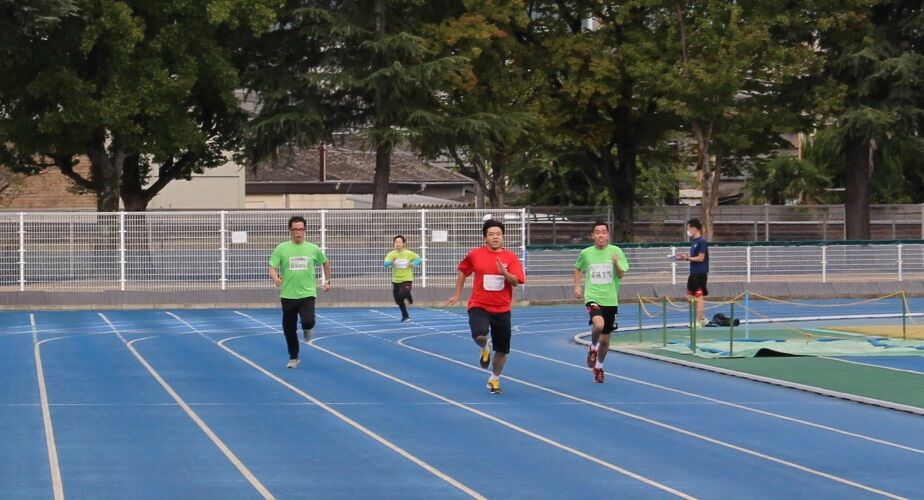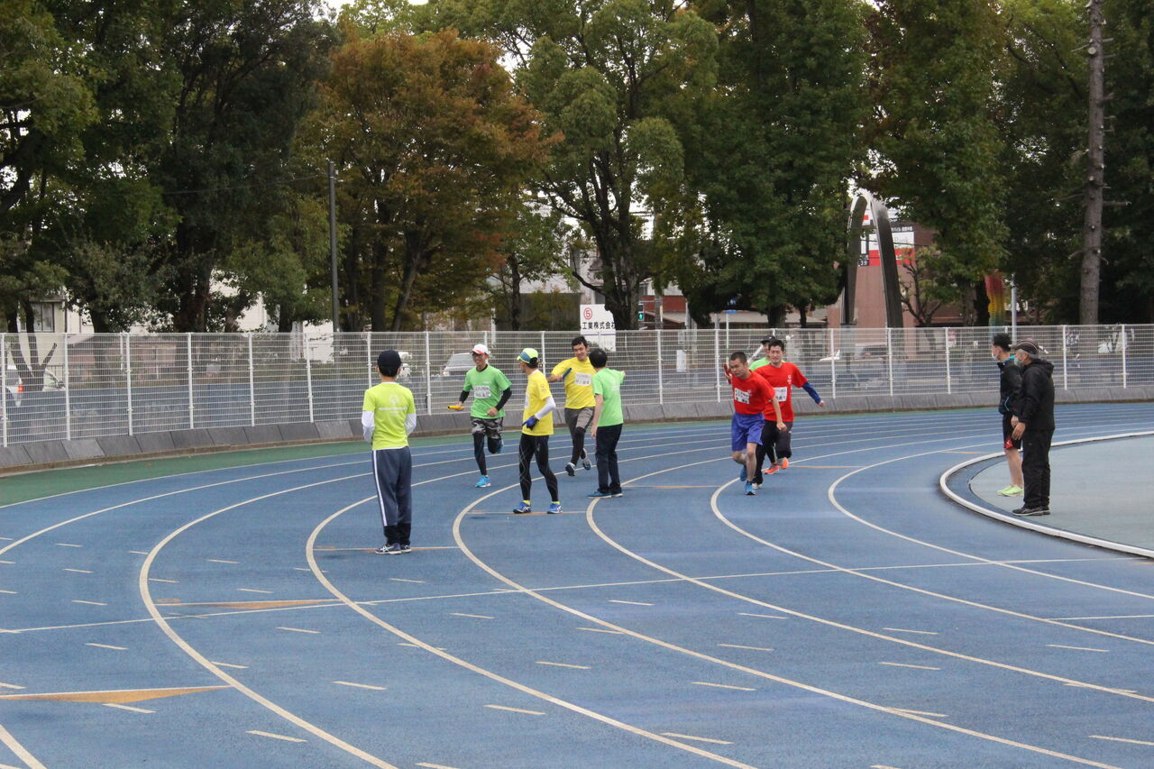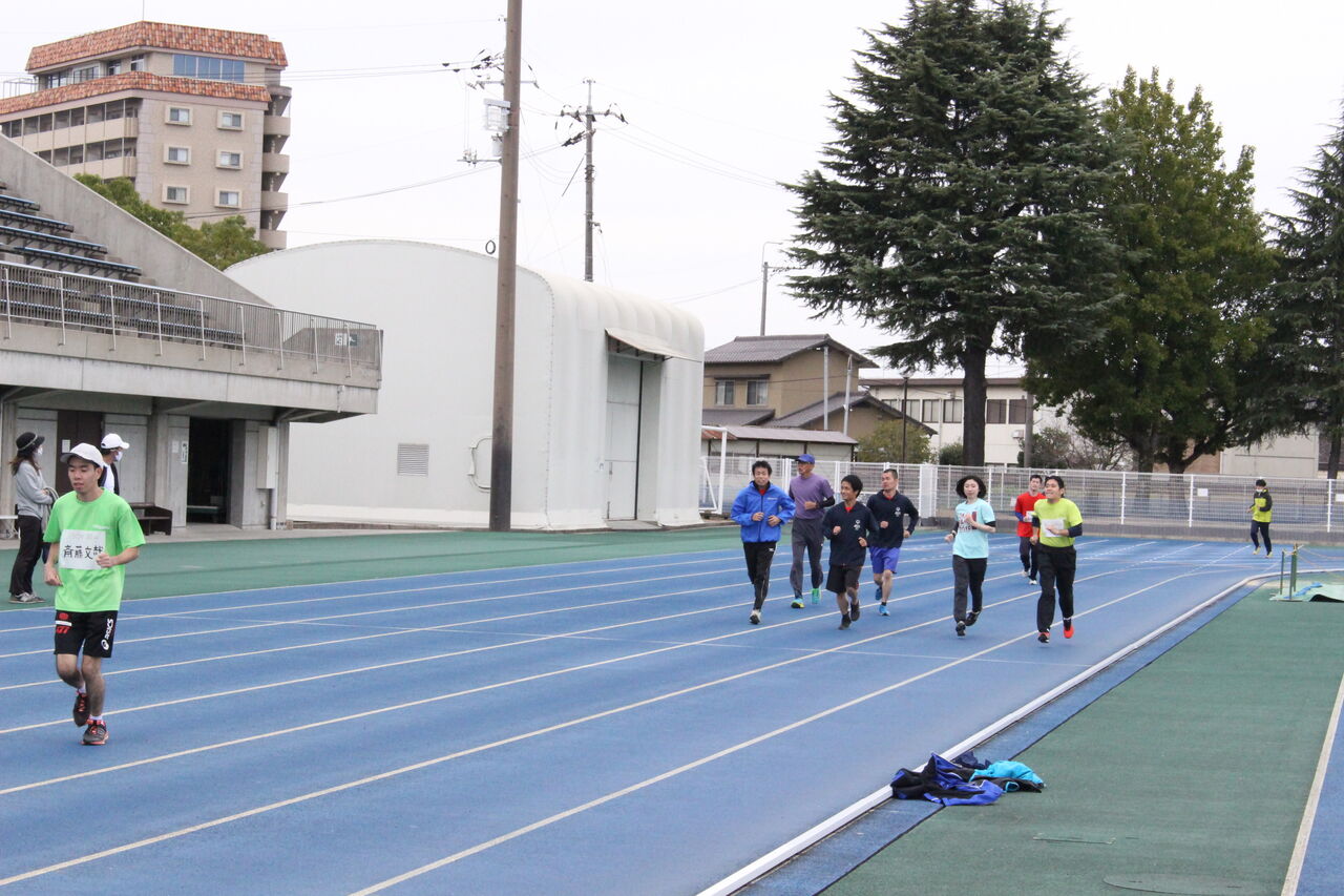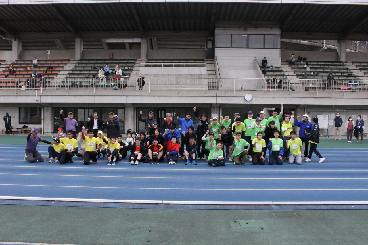 コーチ・ファミリー有志総勢54人がトラックを思い思いのペースで走り全員の周回を記録しました。