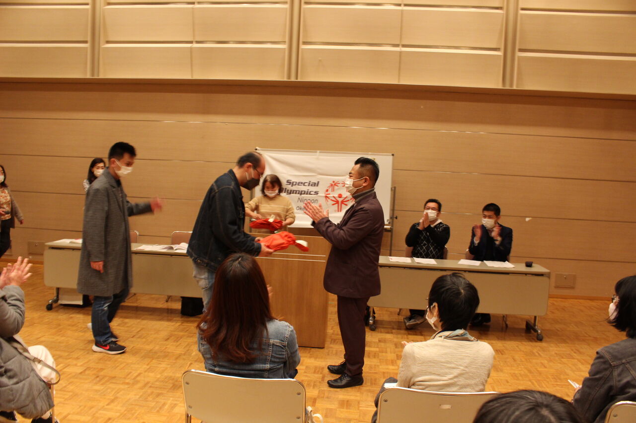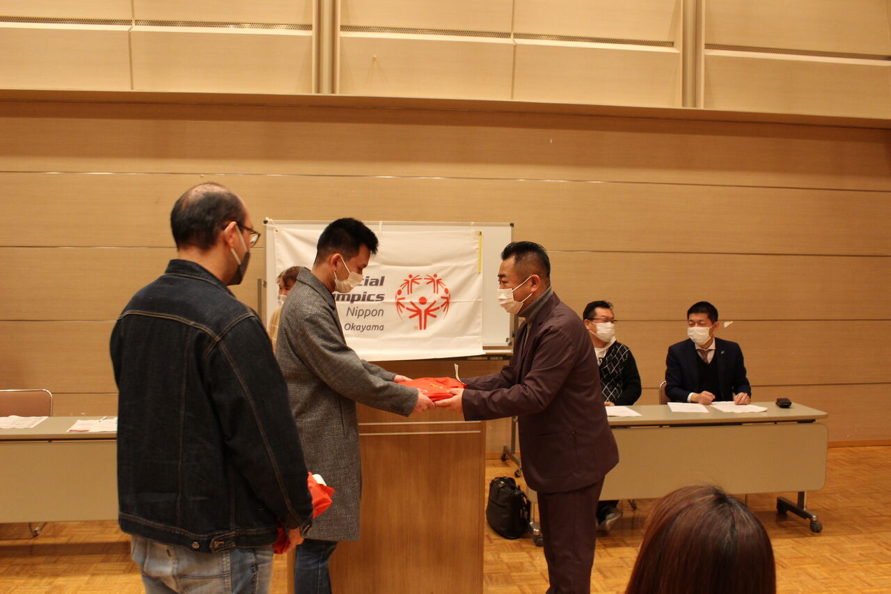 昨年実施したアスリート委員会主催の「縄跳びチャレンジ」の表彰をファミリー総会の会場で行いました。結果についてはブログで発表しましたが、個人の部1位と2位のアスリートに吉田会長より賞品を渡していただきました。
