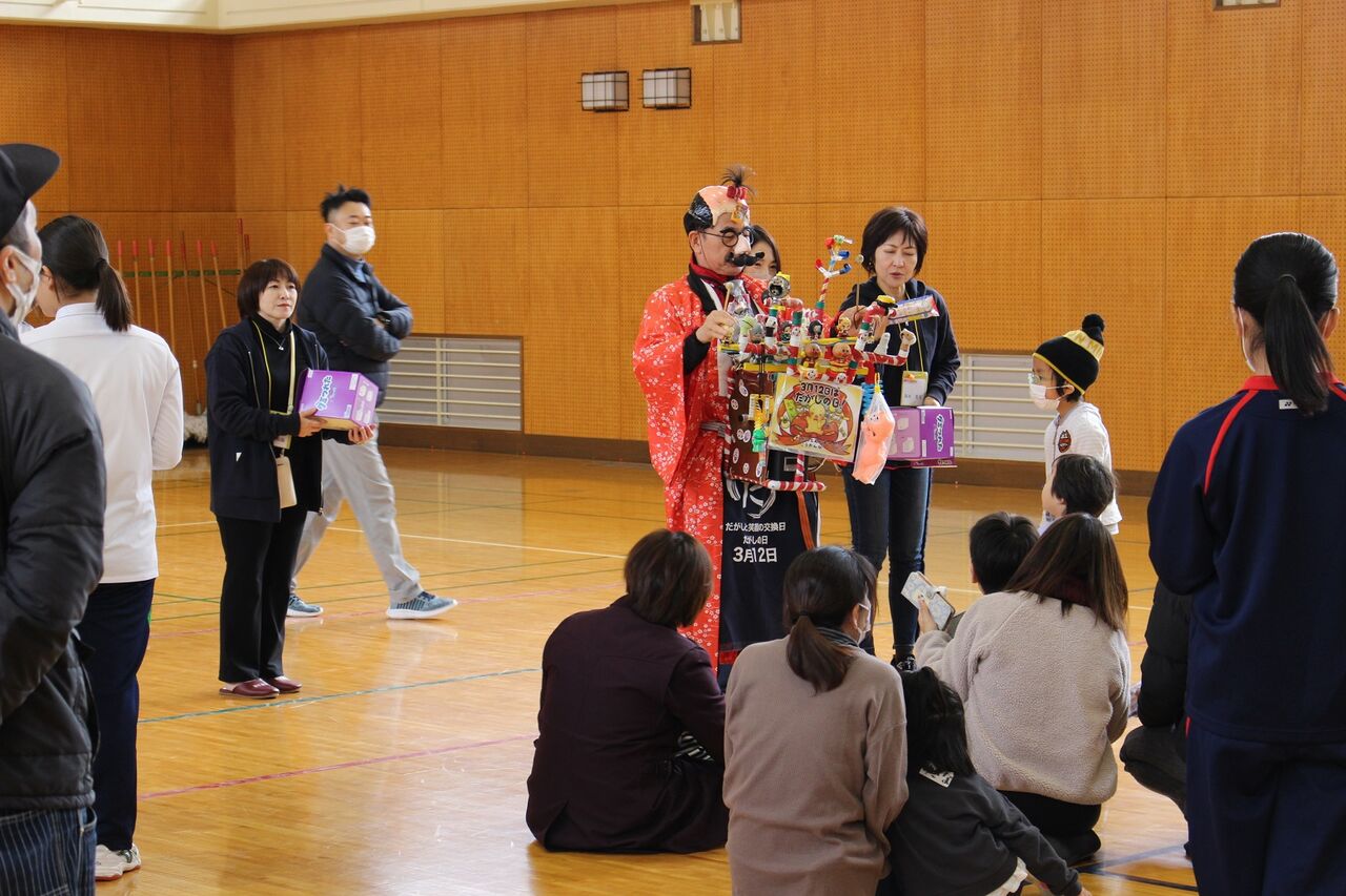 投げて楽しみました。ゲームの後はお菓子のおじさんが登場!一気に子どもたち