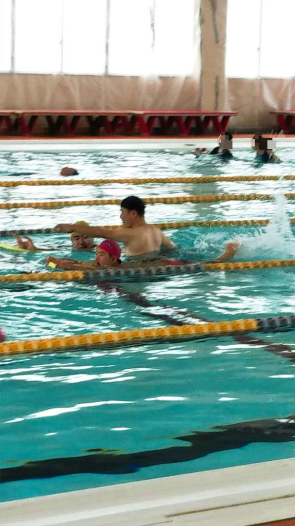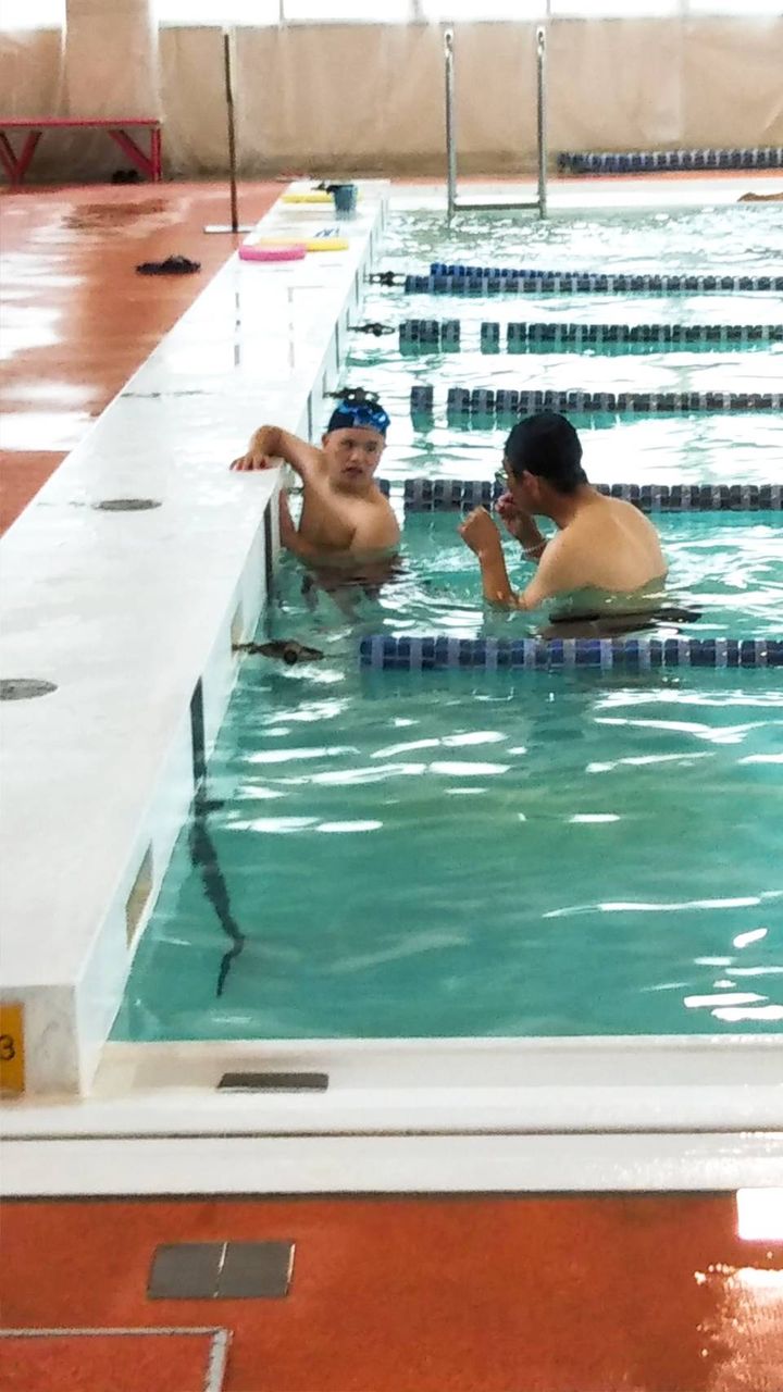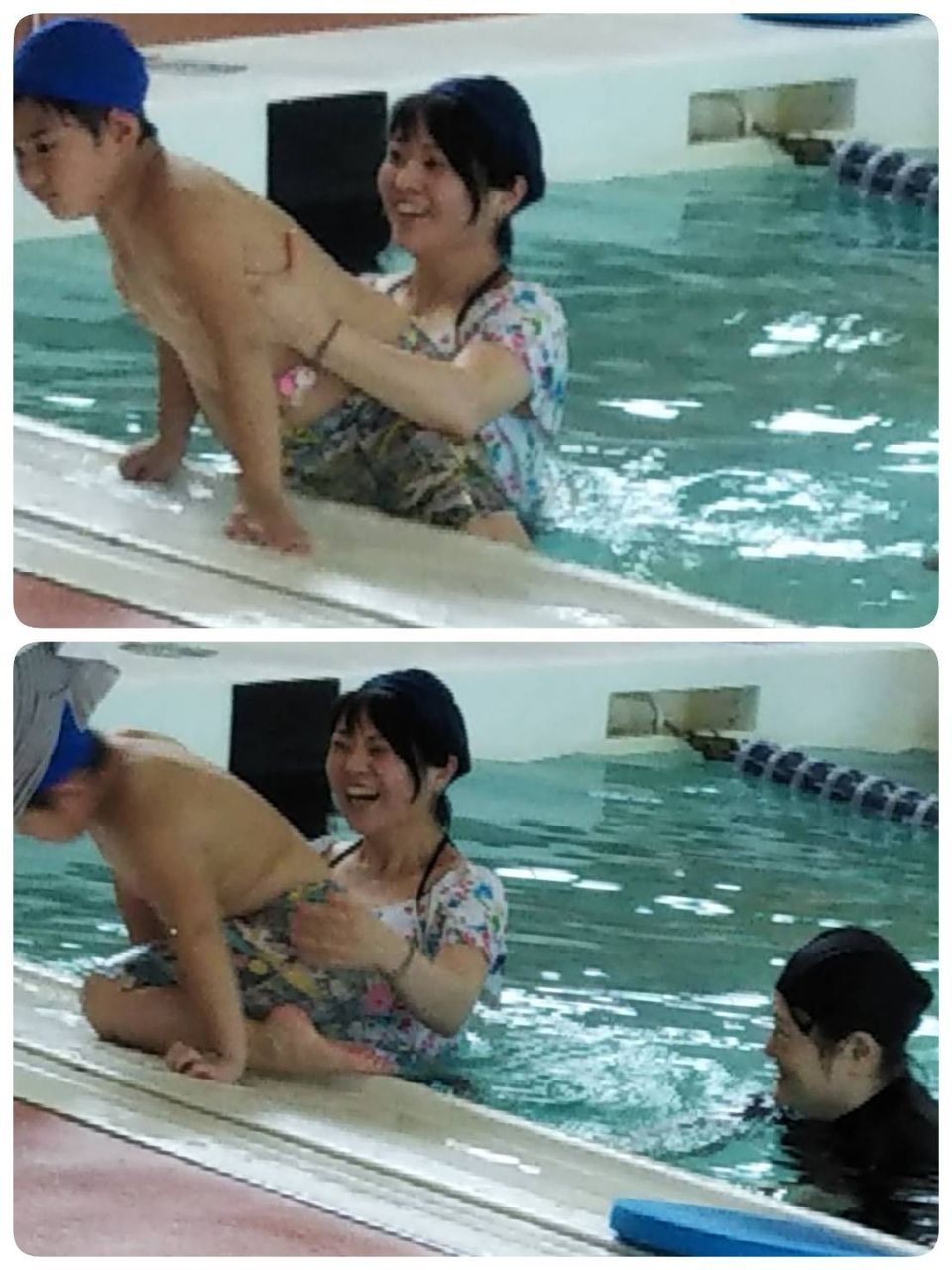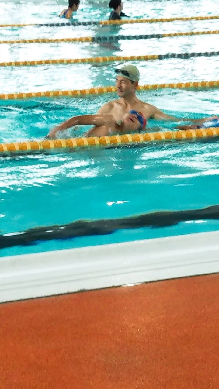 深いプールにデビューしたてのアスリートには、緊張緩和にもなるので、ヘルパーを積極的に活用しています。