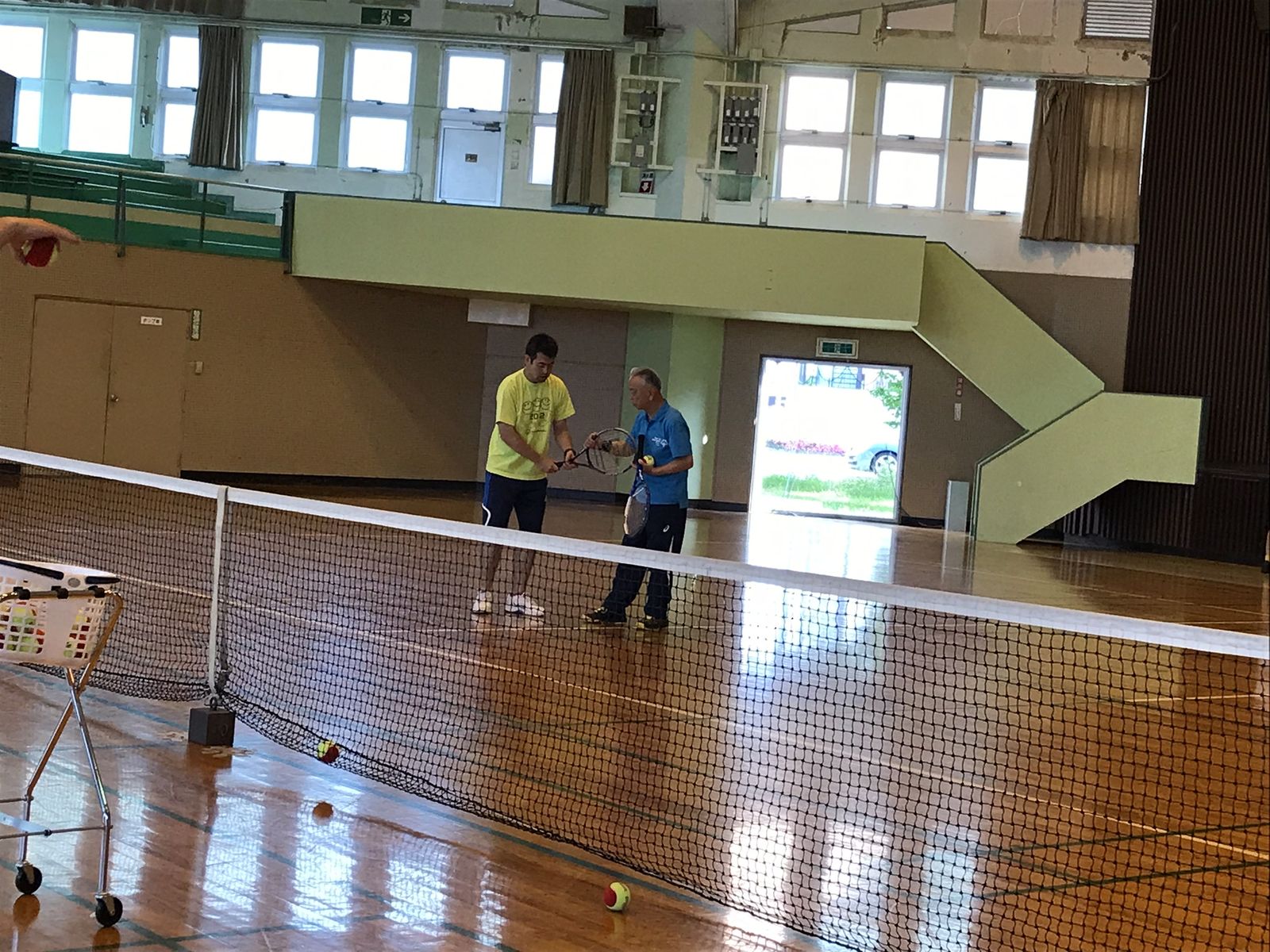 ストローク練習のはじめは、コーチがボールを手で投げて、アスリートが打ちやすい状態で、きれいにネットの向こうに返球できように、頑張ります。
