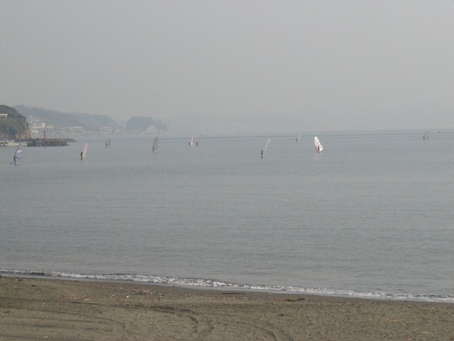 駅前の小さな商店街を抜けるとすぐに海岸に出ます。この日は薄曇りでけっこう蒸し暑くTシャツで過ごせました。海岸にはウィンドサーフィンの帆がたくさん出てますね^^