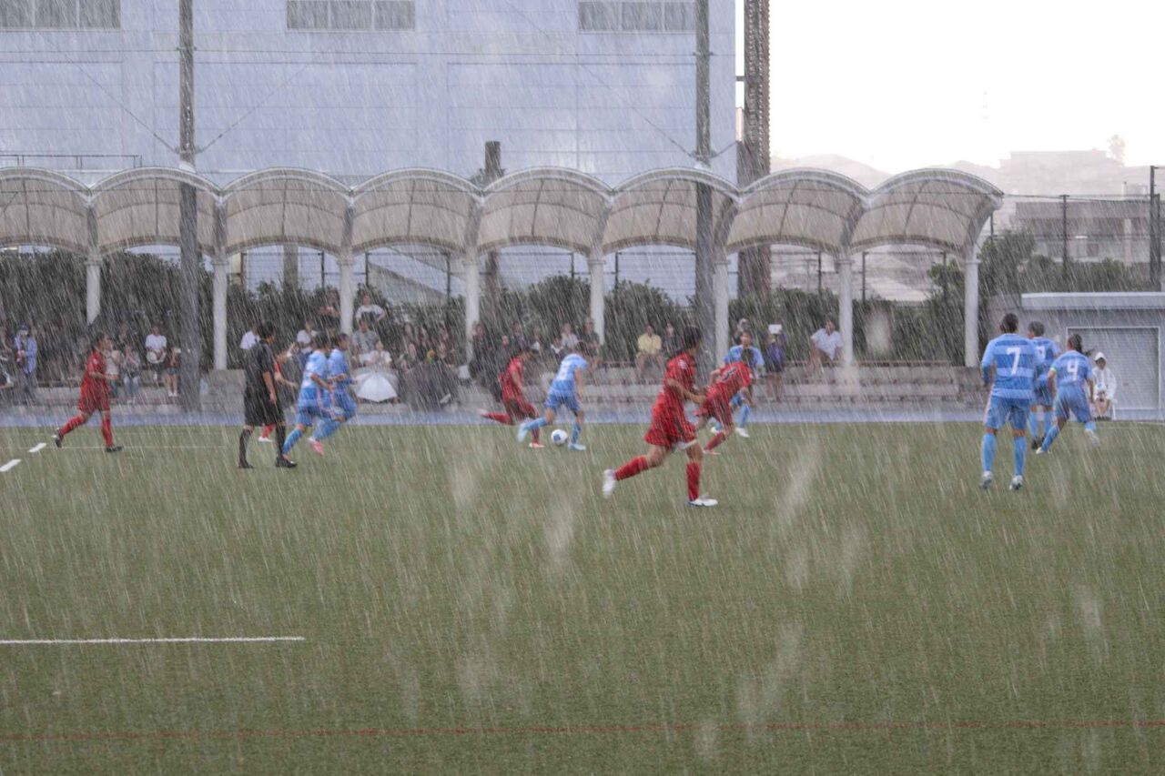 大雨・雷のため試合が何度か中断し、