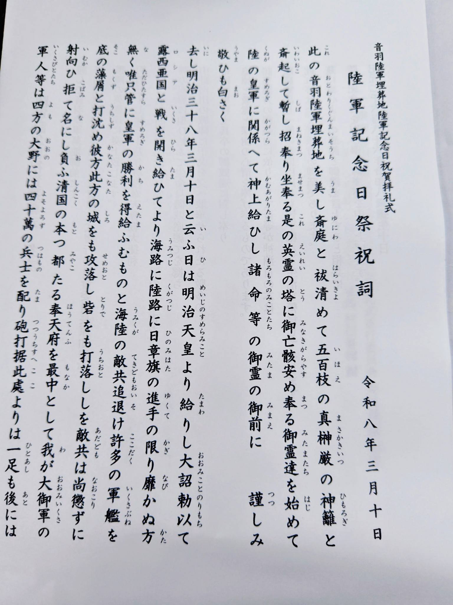 東京郷友会松藤昭氏祝詞・勝鬨、献歌「陸軍記念日を祝う歌」奉奏、