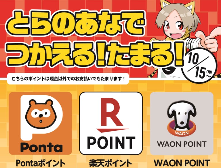 【貯めて使える】とらのあな一部店舗にてPonta・楽天ポイント・WAON POINTが15日から利用可能になった件 2018年10月16日 カテゴリ:ヲタ系ニュース 15日から【Pontaポイント】【楽天ポイント】【WAON POINT】が 一部店舗にて利用可能になったとらのあな。 使用上の注意点等をサクッと取材して来たので、記事にしたいと思います。 『【貯めて使える】とらのあな一部店舗にてPonta・楽天ポイント・WAON POINTが15日から利用可能になった件』の続きを読む タグ :#とらのあな#WAON#Ponta#楽天
