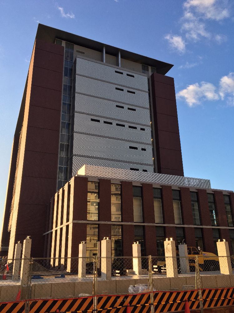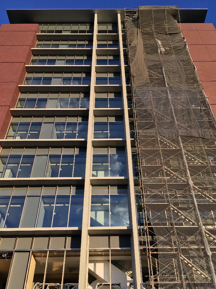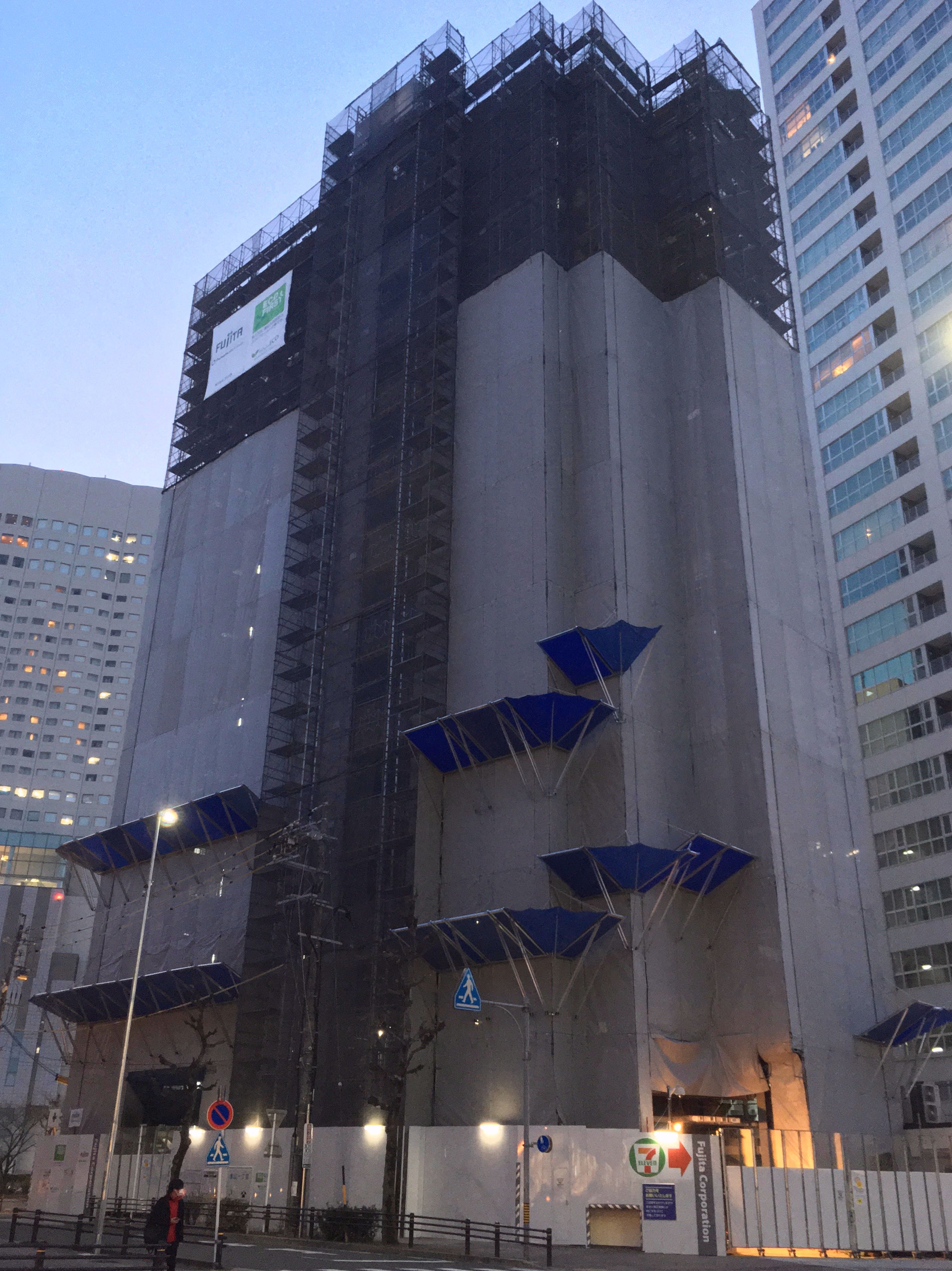 西側壁面もシート類も撤収され綺麗に。8階部分の南西角の柱は剥き出し状態?の意匠。