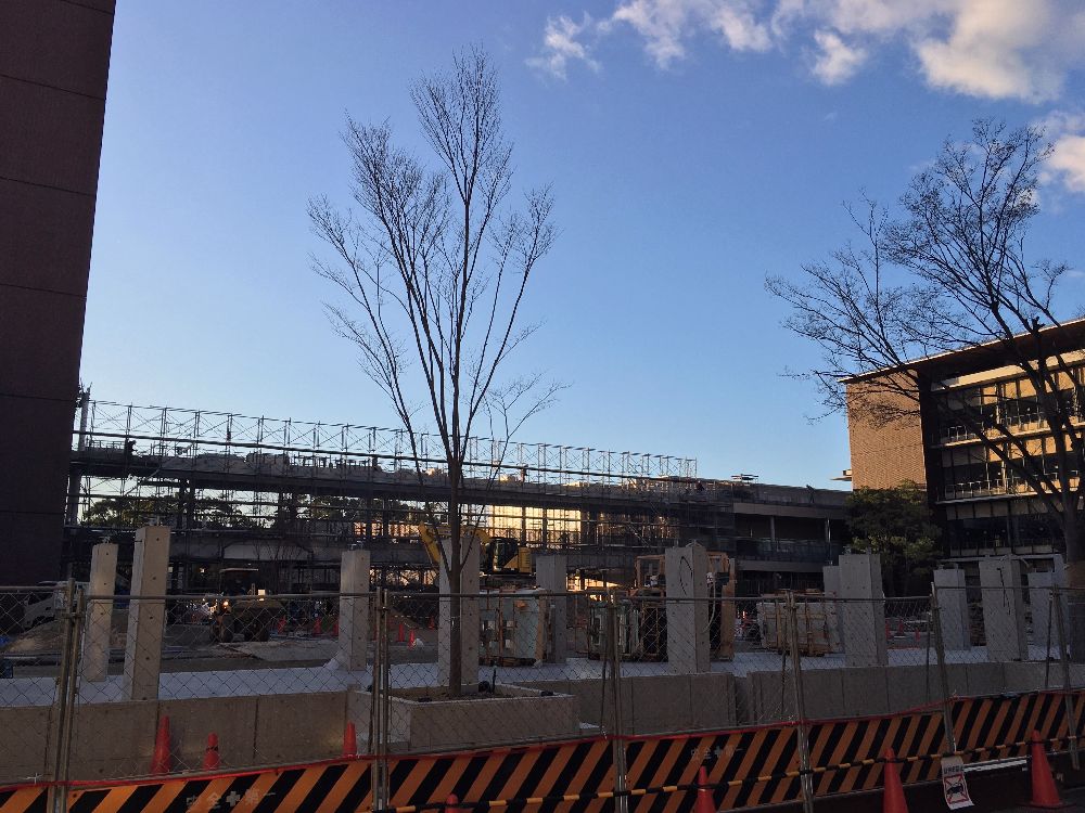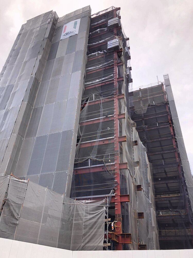 中央の凹んでいた部分も鉄骨が組まれ始めました(下の方)。まもなく全てが組み上がりそうかな。
