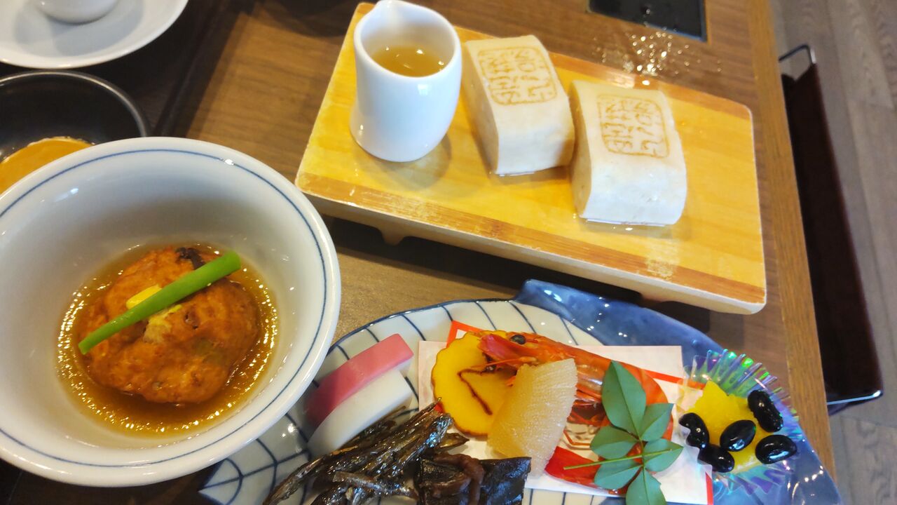 しっかり祝い皿、がんもどき、白い出汁巻たまごがでてきて、さらに蒸籠蒸野菜もあり、なかなかボリューミーでした。