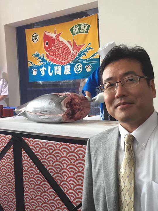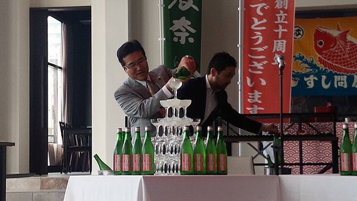 シャンパンタワーならぬ日本酒タワーを行いそれからマグロの解体ショーを行いました。