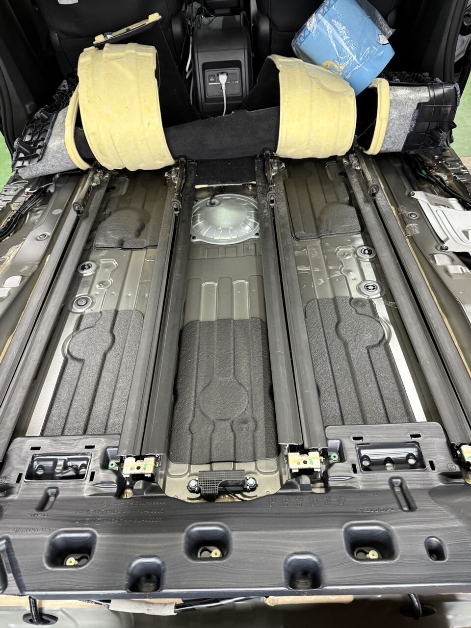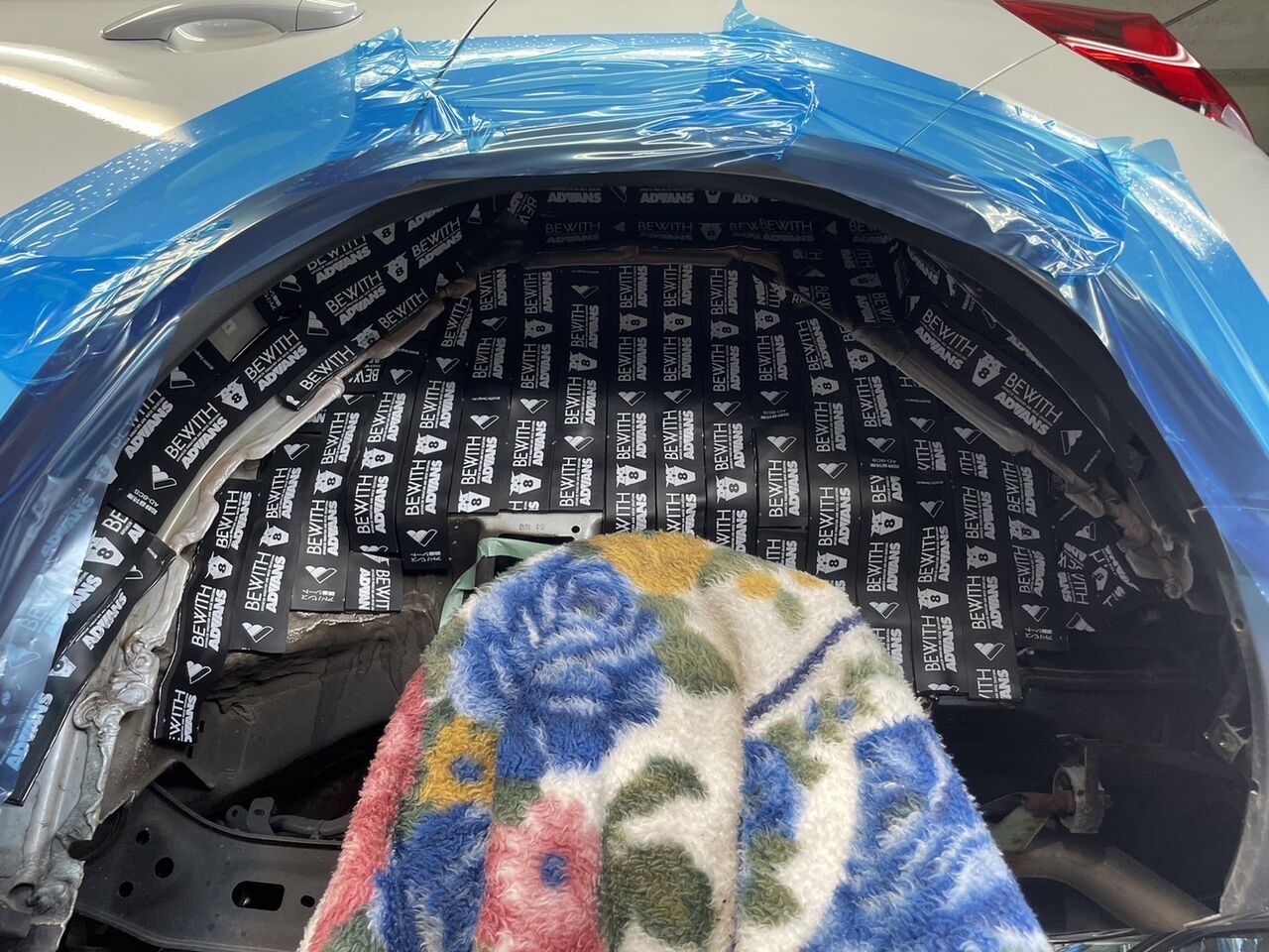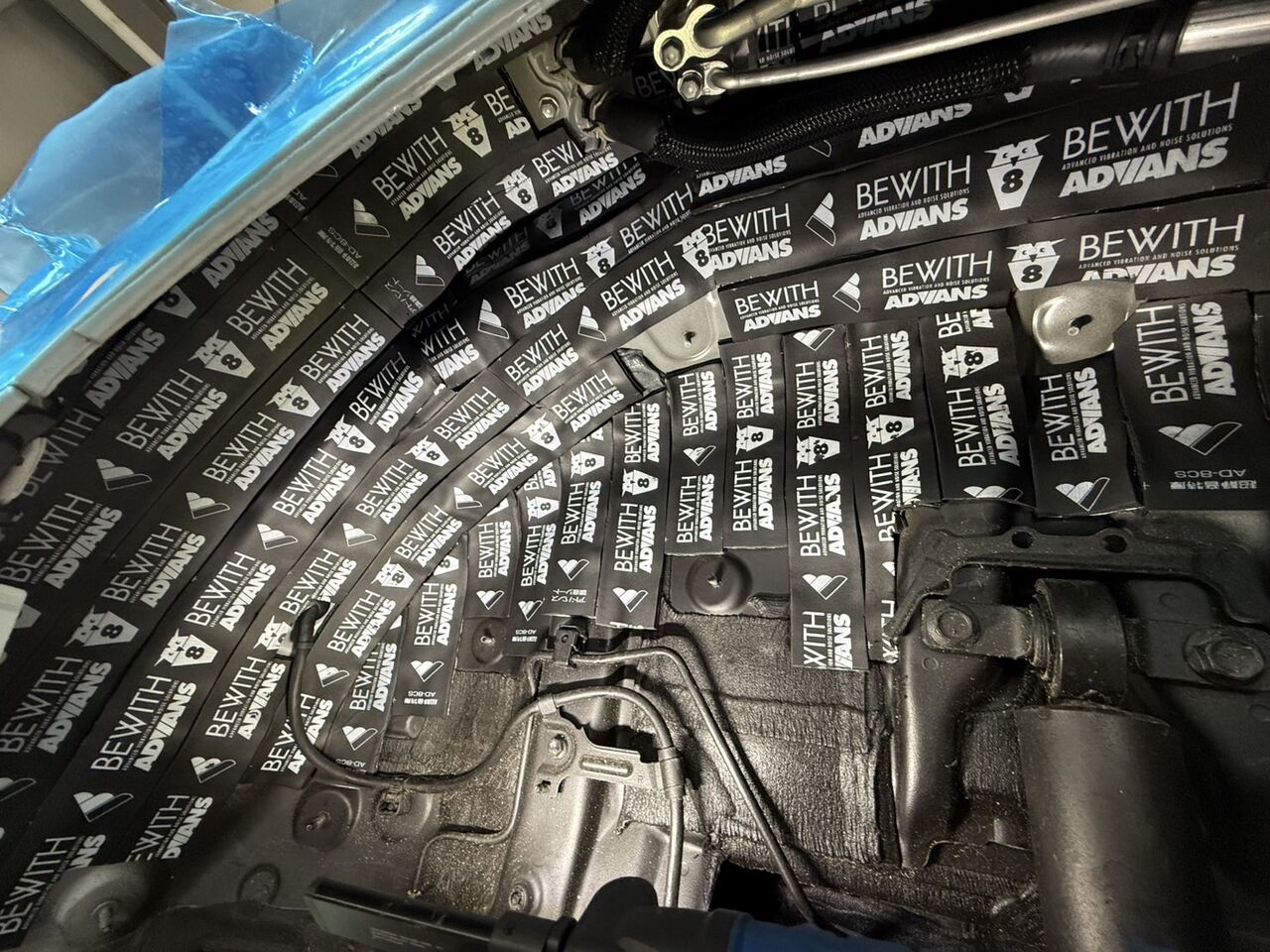 調音施工の「基本プログラム」をベースに、オプション「バルクヘッド部」、「フェンダー部」、「リアラゲッジ」、さらにリアシート下、ルーフには遮熱施工を施させていただきました。