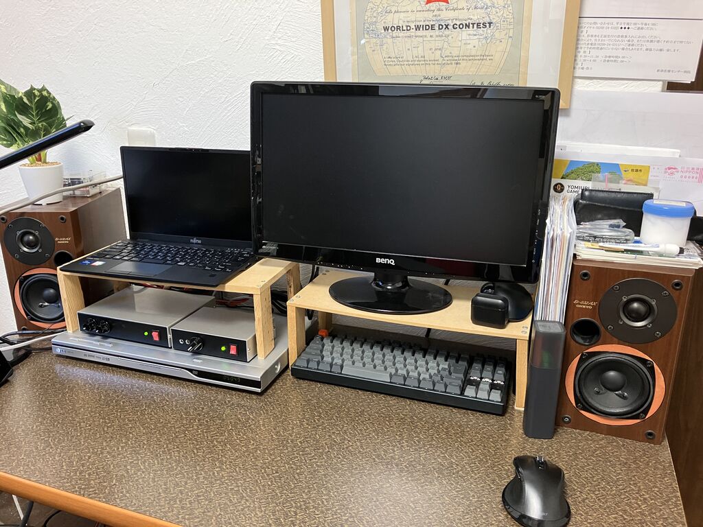 CDプレーヤーの上に並べて置いたところ。二つのアンプはCDプレーヤーの出力端子を差し替えて使わねばならず不便(切替器を作りたくなった)。スピーカーはエッジが切れたONKYO製のジャンク(ハードオフ)を秋月500円スピーカーに入れ替えたもの。PCDが合わないのでMDFで作ったスペーサーをかましてある。
