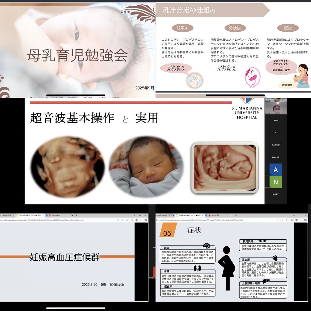 5東病棟ではスタッフみんなが安心して学び、働けるように、定期的にさまざまな勉強会を開催しています。今年度は胎児エコーや母乳、妊娠高血圧などの勉強会を行い、日々のケアに役立つ内容や最新の医療知識や技術の学びを深めています。一人で継続学習することはとても大変なので、病棟全体で学びをサポートし、より良い看護・より良い医療が提供できるように取り組んでいます。