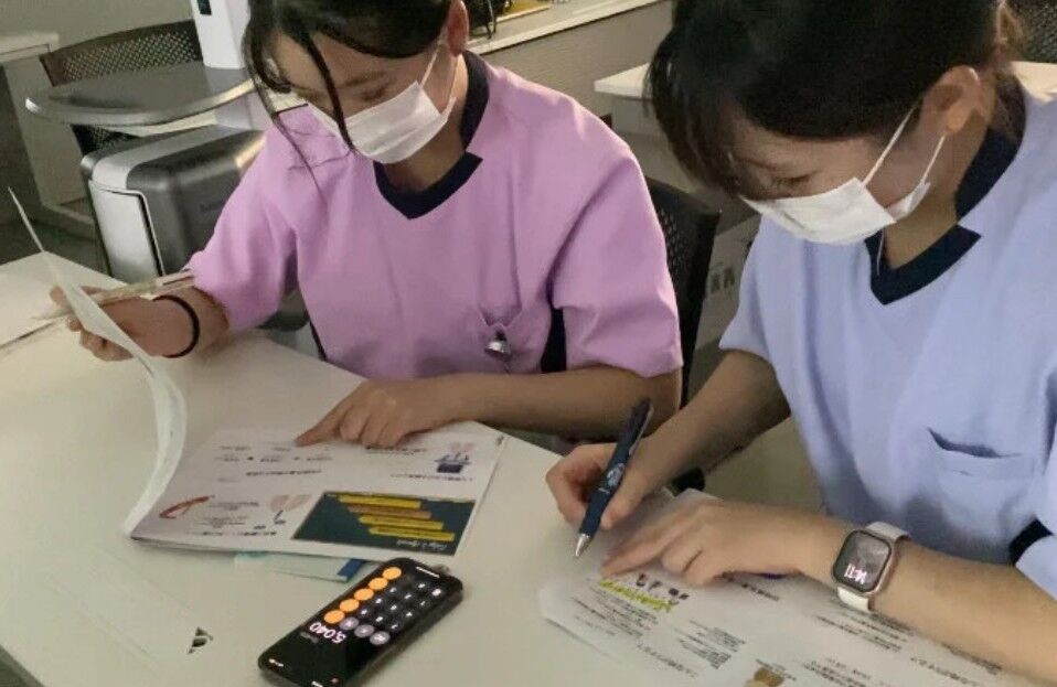 また、人工呼吸器の設定が正しいかを知るために、計算が必要な場面があります。そこで、適切な呼吸器設定であるか、電卓を使用して一緒に計算をしながら、どの数値がどんな意味を持つのかを学びました。アプリを使ってゲーム感覚で楽しめるように工夫をして問題を出したので、楽しく学ぶことができました。